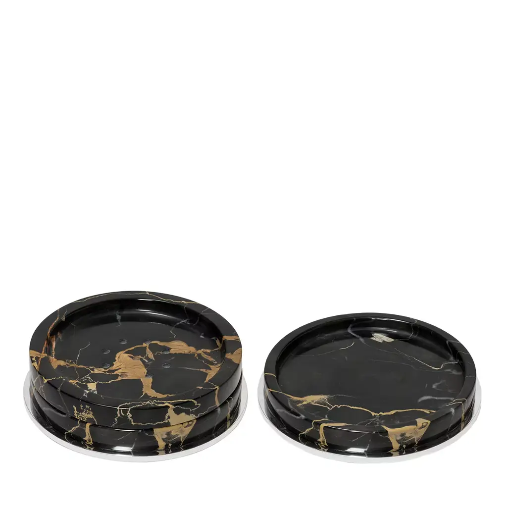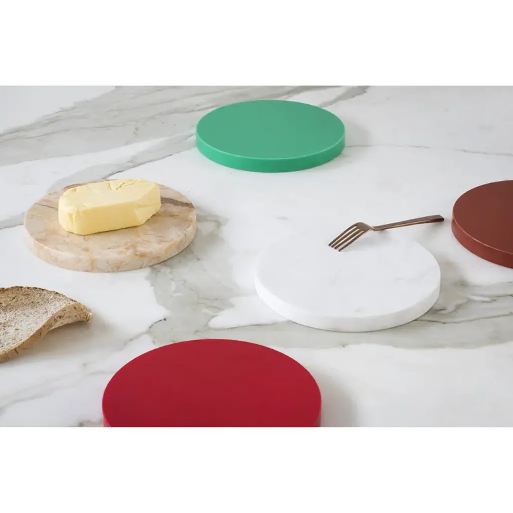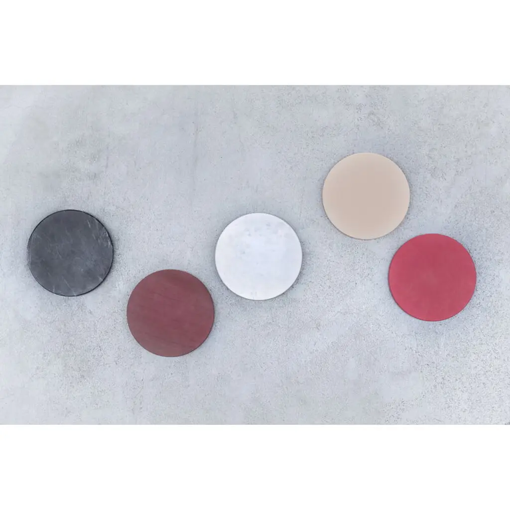Five Circles by valerie objects are both functional everyday objects and sophisticated geometric decorative pieces. Designed by Muller Van Severen, the Five Circles set is a perfect example of the design studio's ideology, which encourages keeping objects as part of the décor rather than hiding them out of view after use. The round trays bring color and joy to table settings, but can also be used to hold small treasures in the other rooms of the home. Try creating a charming tower of five circles that can then be dismantled piece by piece: every time you need a plate or tray, just grab a new circle from the stack! Set C contains five pieces: a white, burgundy and light blue plastic circle and one dark and one light marble tray.
