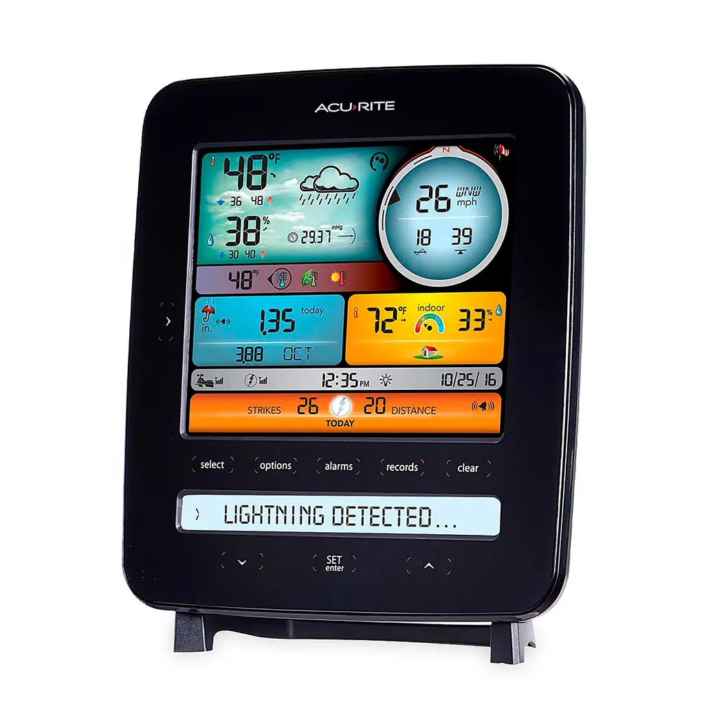 Make tracking the weather in your area a snap with our 5 in 1 Weather Station. Watch as animated color forecasts transform as the weather changes.Easy to read color display provides real time weather data from your yard or garden. This wireless weather station monitors your forecast and temperature.Captures indoor and outdoor temperature and shows all the vital rainfall, wind, lightning detection, humidity and barometric pressure information you need. The home base is powered by a 5V AC adapter. You can also insert 6 AA batteries as back up in the event of power failure. The lightning detector requires 4 AA batteries (sold seperatley)You can add up to two indoor or outdoor temperature and humidity sensors (sold seperately).