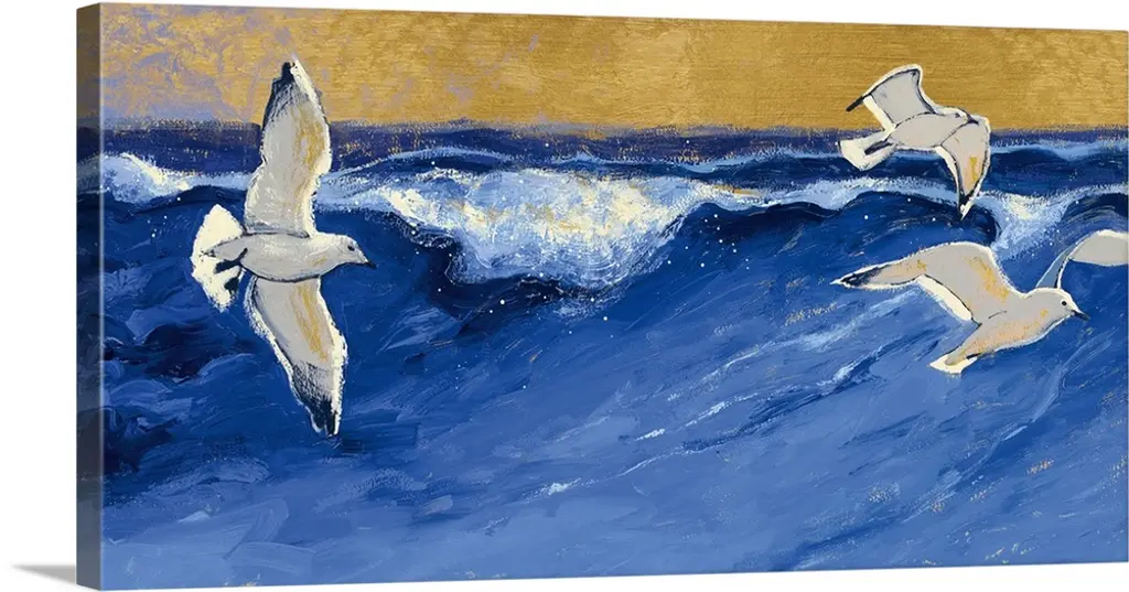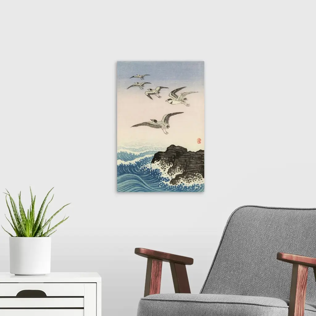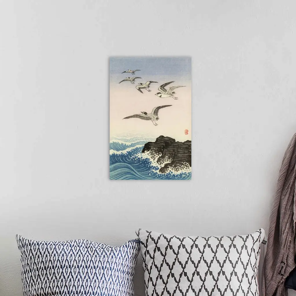 Five Seagulls Above a Rock in the Sea by Japanese artist Ohara Koson, 1877 - 1945. Ohara Koson was part of the shin-hanga, or new prints movement.