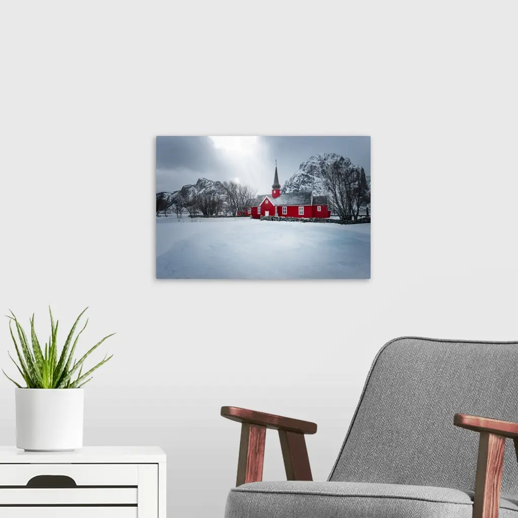 A photograph of red church seen in a wintry landscape.