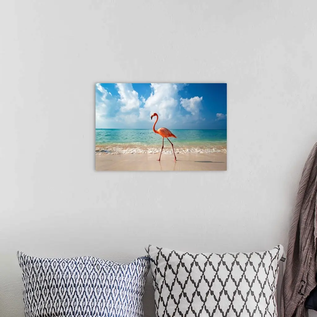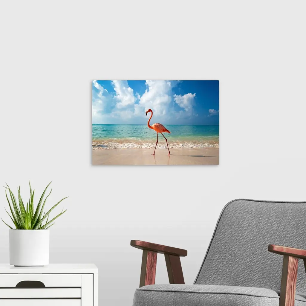 Flamingo Walking Along Beach wall art for home and office decor. Discover canvas art prints, photos, mural, big canvas art and framed wall art in GreatBigCanvas.com's varied collections.