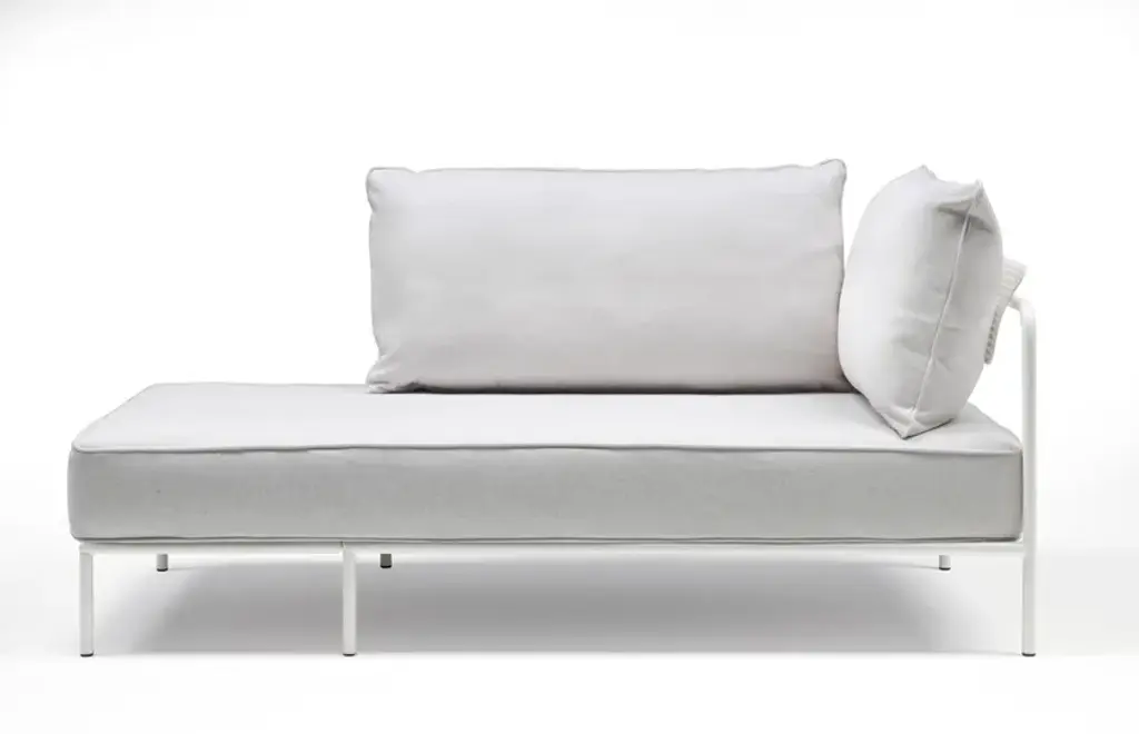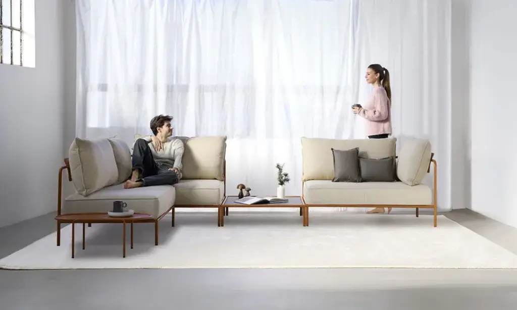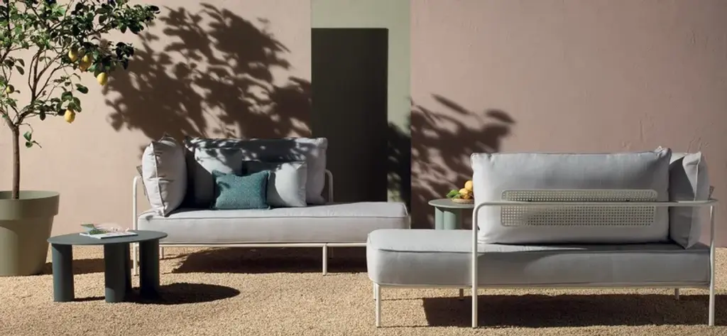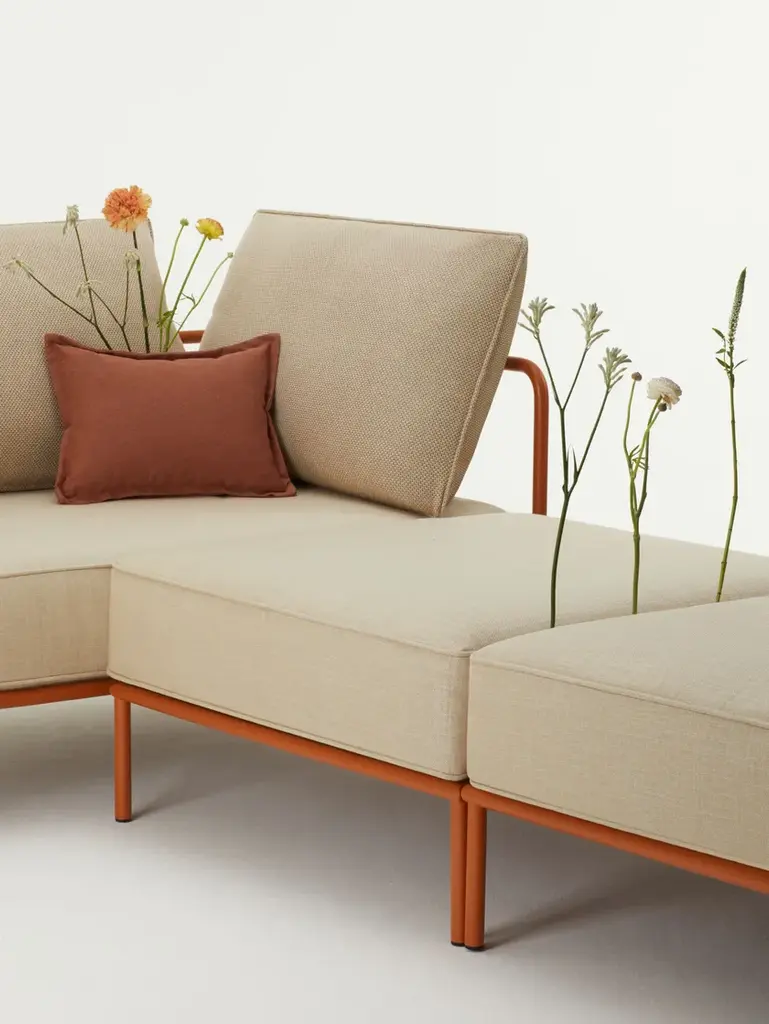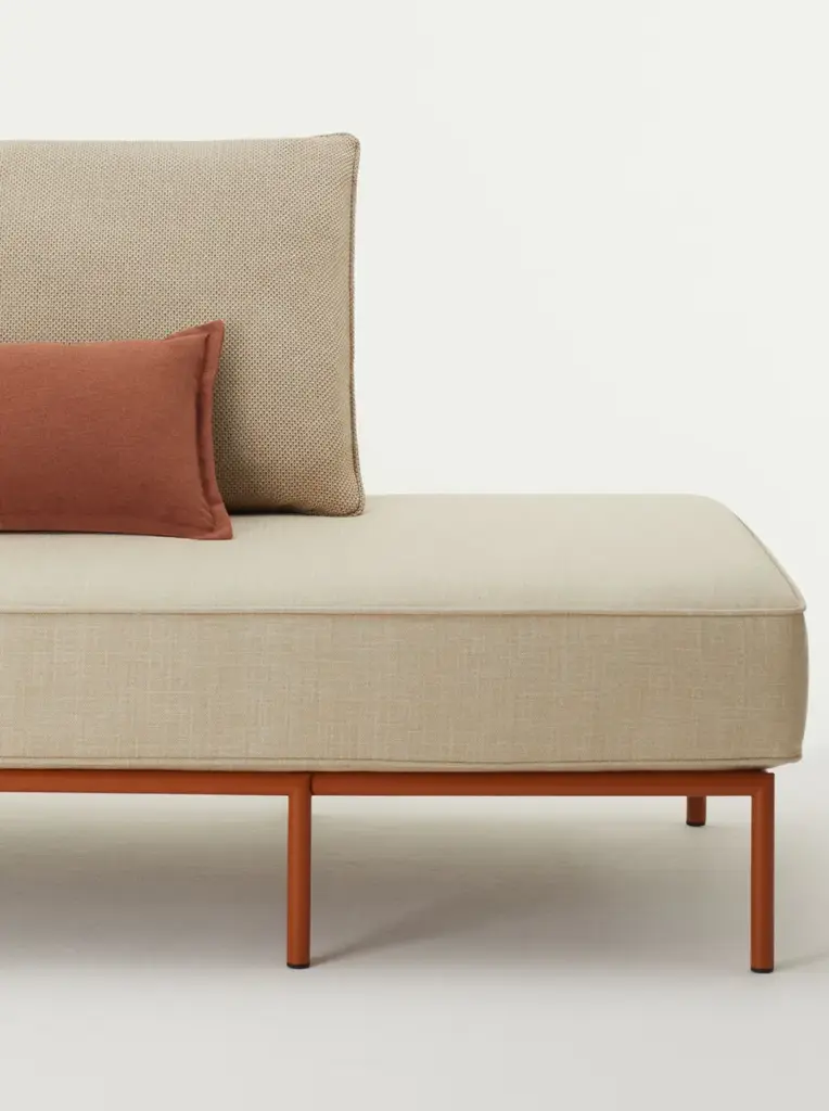 FLAP by Meneghello Paolelli, the first series of modular upholstered furniture where seating elements are combined in compositions with support surfaces, similarly shortens the gap between indoor and outdoor. To support the rear cushions, elements resembling aircraft flaps are attached to the backrest part of the main structure.The FLAP sofa designed by Meneghello Paolelli in 2023 was the first collection of modular upholstered furniture where the seating elements combine in a composition with support surfaces. In April 2024, S-CAB’s modular system is enriched with modules that complete the proposal with chaise longue elements (right and left), armchair, and pouf. Flap thus becomes a true system, suitable for spaces of different sizes, comfortable, adaptable to both residential and contract solutions.The structure, minimalist in style, has elements fixed in the backrest that recall in shape the flaps of airplanes. This creates a movable backrest that rests on the tubular structure and that can rotate on the axis about 15 degrees, allowing the rear support cushion to have different inclinations to achieve the best possible comfort level.The frame, with the support of the flaps, seems to wrap around the line of cushions that define the perimeter of the upholstery, generating a continuous contrast between the softness and ‘fullness’ of the padding and the lightness and ‘emptiness’ of the structure that envelops it.The system consists of eight elements that allow you to obtain many compositions.