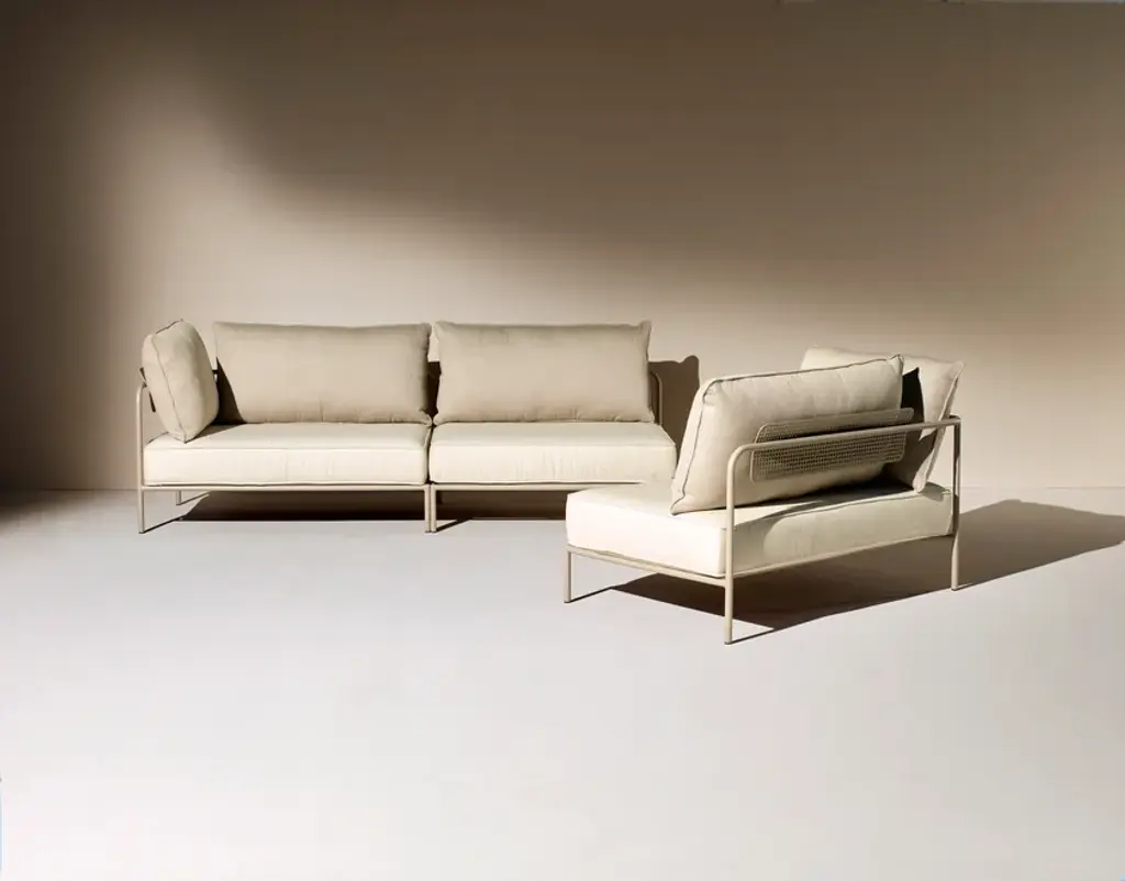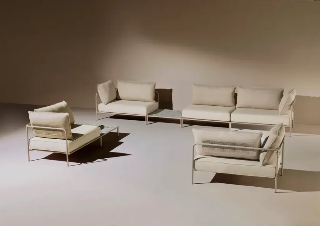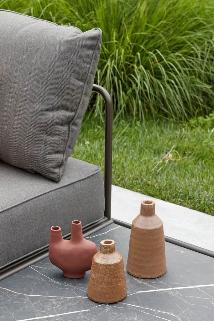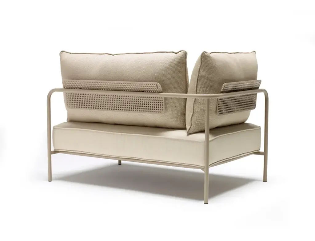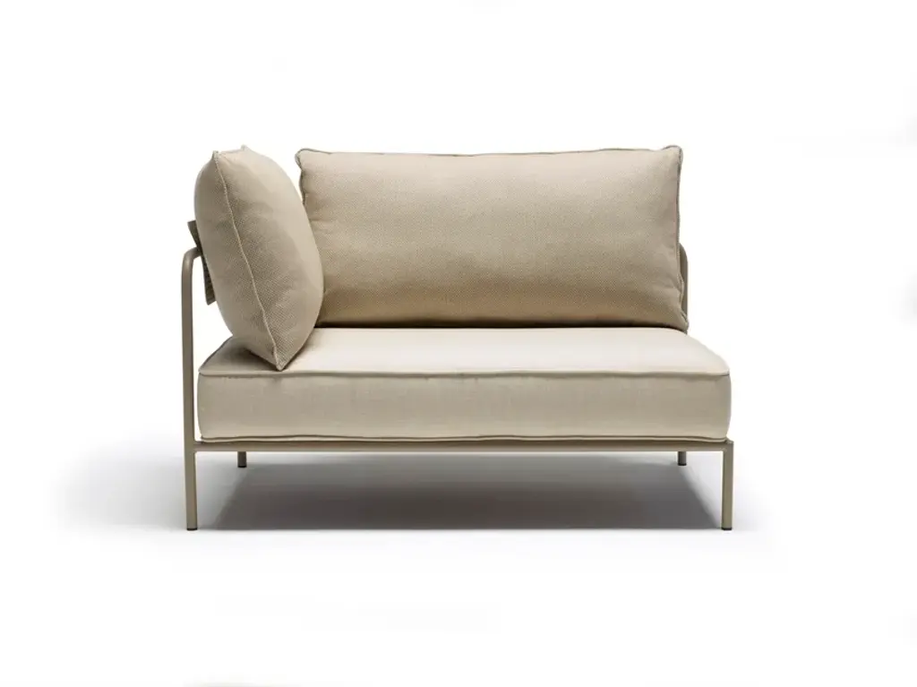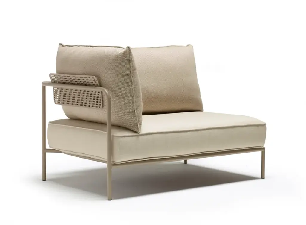 Flap is a modular garden armchair with a metal frame in colours: linen, dove grey, anthracite, mocha and terracotta. Wide range of outdoor fabrics.FLAP by Meneghello Paolelli, the first series of modular upholstered furniture where seating elements are combined in compositions with support surfaces, similarly shortens the gap between indoor and outdoor. To support the rear cushions, elements resembling aircraft flaps are attached to the backrest part of the main structure.The FLAP sofa designed by Meneghello Paolelli in 2023 was the first collection of modular upholstered furniture where the seating elements combine in a composition with support surfaces. In April 2024, S-CAB’s modular system is enriched with modules that complete the proposal with chaise longue elements (right and left), armchair, and pouf. Flap thus becomes a true system, suitable for spaces of different sizes, comfortable, adaptable to both residential and contract solutions.The structure, minimalist in style, has elements fixed in the backrest that recall in shape the flaps of airplanes. This creates a movable backrest that rests on the tubular structure and that can rotate on the axis about 15 degrees, allowing the rear support cushion to have different inclinations to achieve the best possible comfort level.The frame, with the support of the flaps, seems to wrap around the line of cushions that define the perimeter of the upholstery, generating a continuous contrast between the softness and ‘fullness’ of the padding and the lightness and ‘emptiness’ of the structure that envelops it.The system consists of eight elements that allow you to obtain many compositions.