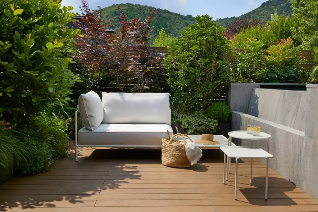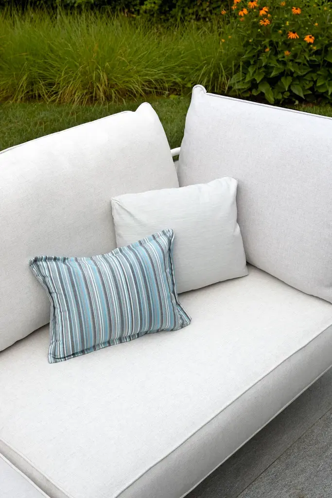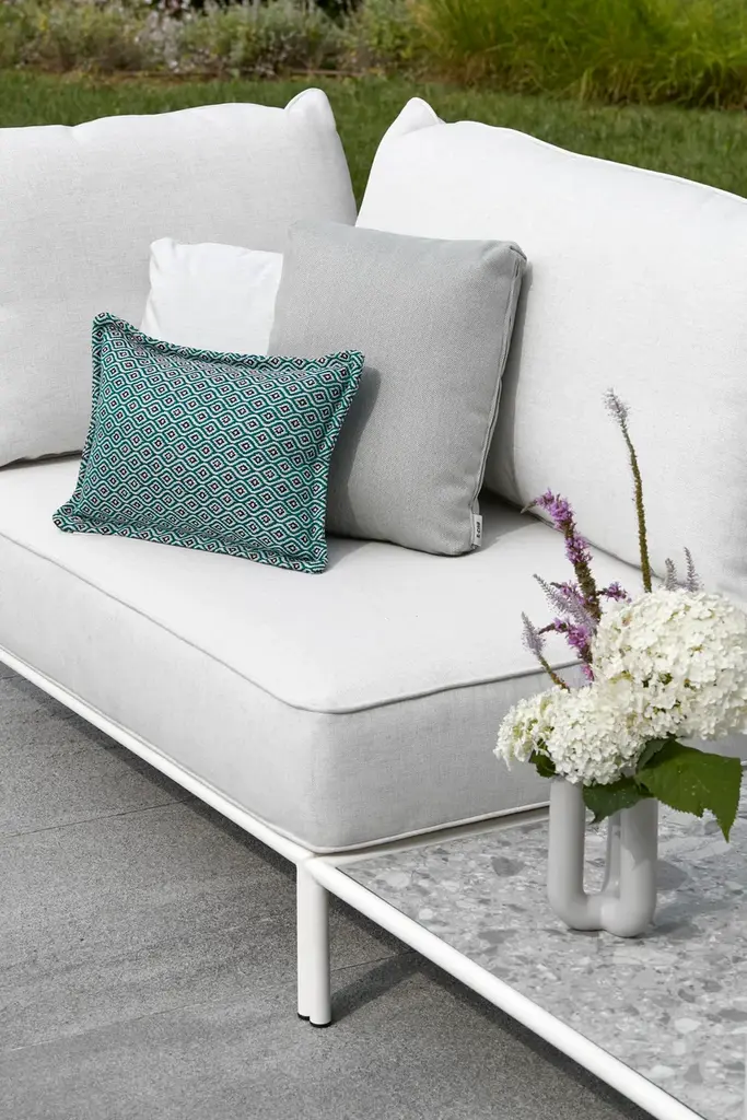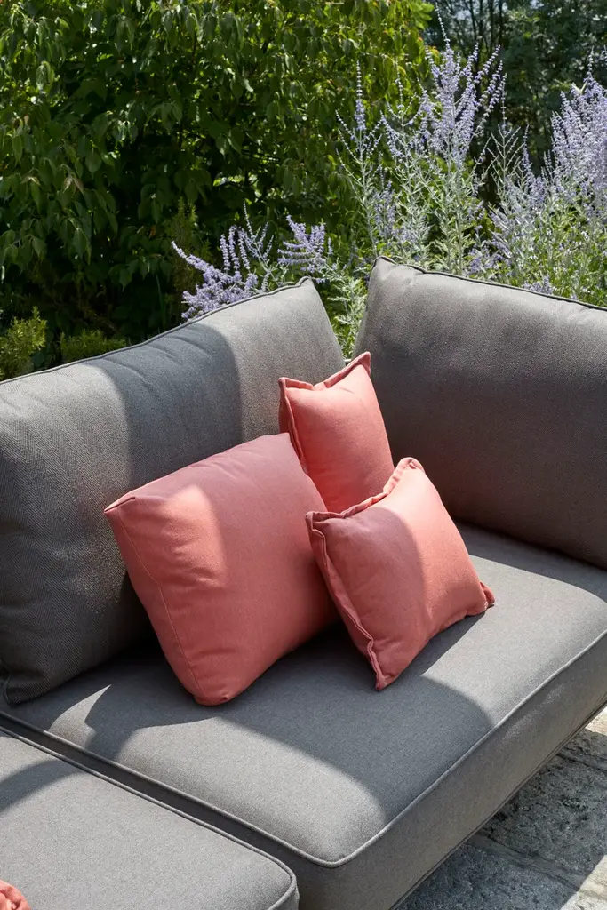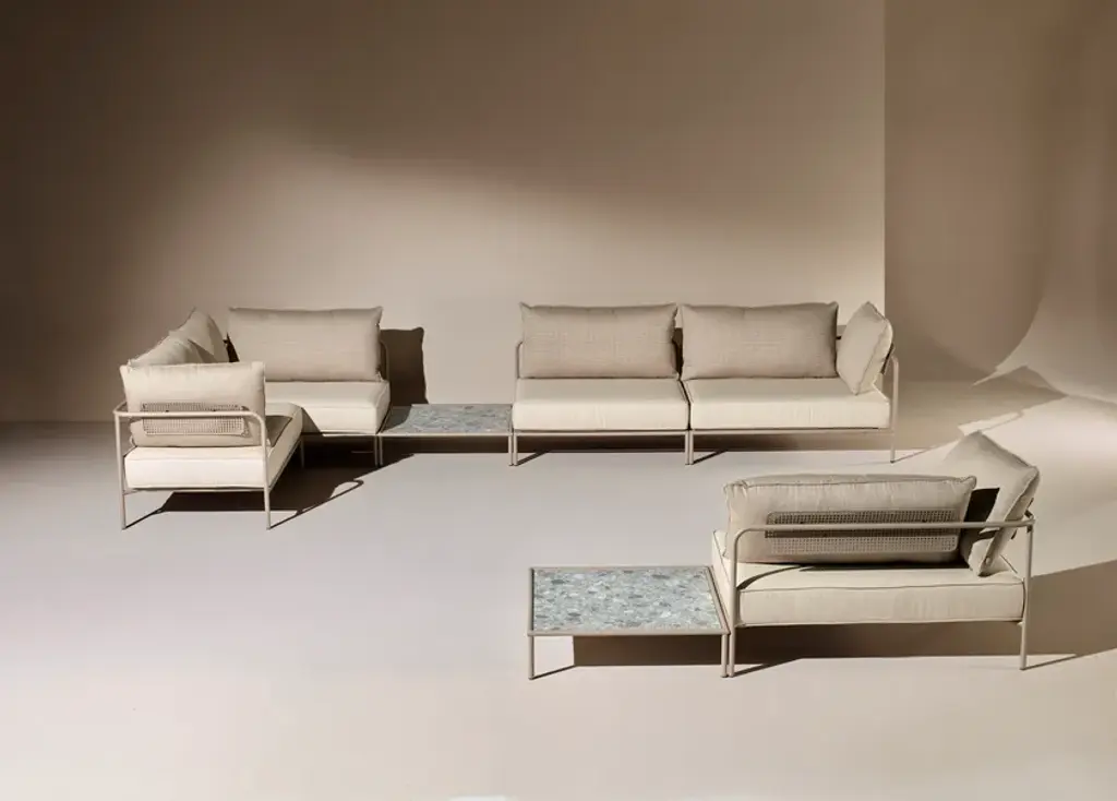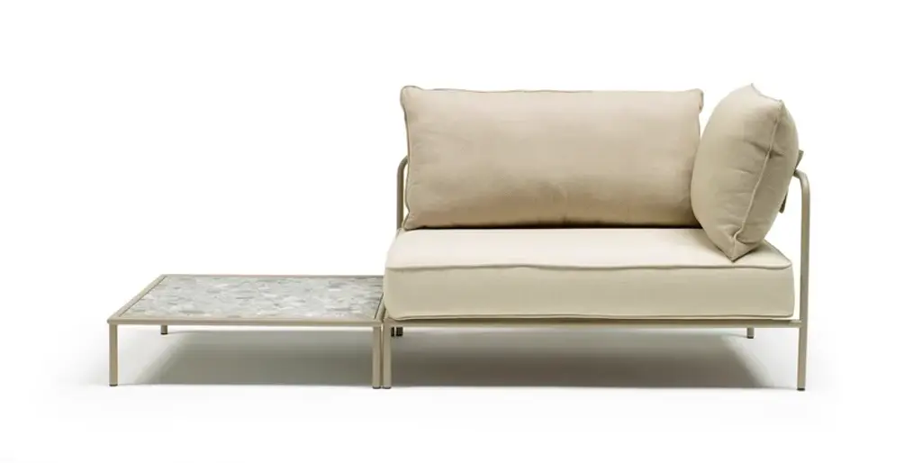 Flap is a modular garden armchair with a metal frame in colours: linen, dove grey, anthracite, mocha and terracotta. Wide range of outdoor fabrics.FLAP by Meneghello Paolelli, the first series of modular upholstered furniture where seating elements are combined in compositions with support surfaces, similarly shortens the gap between indoor and outdoor. To support the rear cushions, elements resembling aircraft flaps are attached to the backrest part of the main structure.The FLAP sofa designed by Meneghello Paolelli in 2023 was the first collection of modular upholstered furniture where the seating elements combine in a composition with support surfaces. In April 2024, S-CAB’s modular system is enriched with modules that complete the proposal with chaise longue elements (right and left), armchair, and pouf. Flap thus becomes a true system, suitable for spaces of different sizes, comfortable, adaptable to both residential and contract solutions.The structure, minimalist in style, has elements fixed in the backrest that recall in shape the flaps of airplanes. This creates a movable backrest that rests on the tubular structure and that can rotate on the axis about 15 degrees, allowing the rear support cushion to have different inclinations to achieve the best possible comfort level.The frame, with the support of the flaps, seems to wrap around the line of cushions that define the perimeter of the upholstery, generating a continuous contrast between the softness and ‘fullness’ of the padding and the lightness and ‘emptiness’ of the structure that envelops it.The system consists of eight elements that allow you to obtain many compositions.