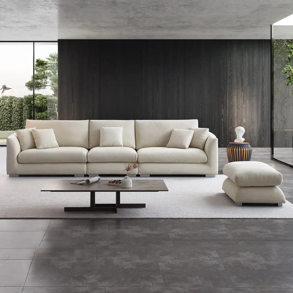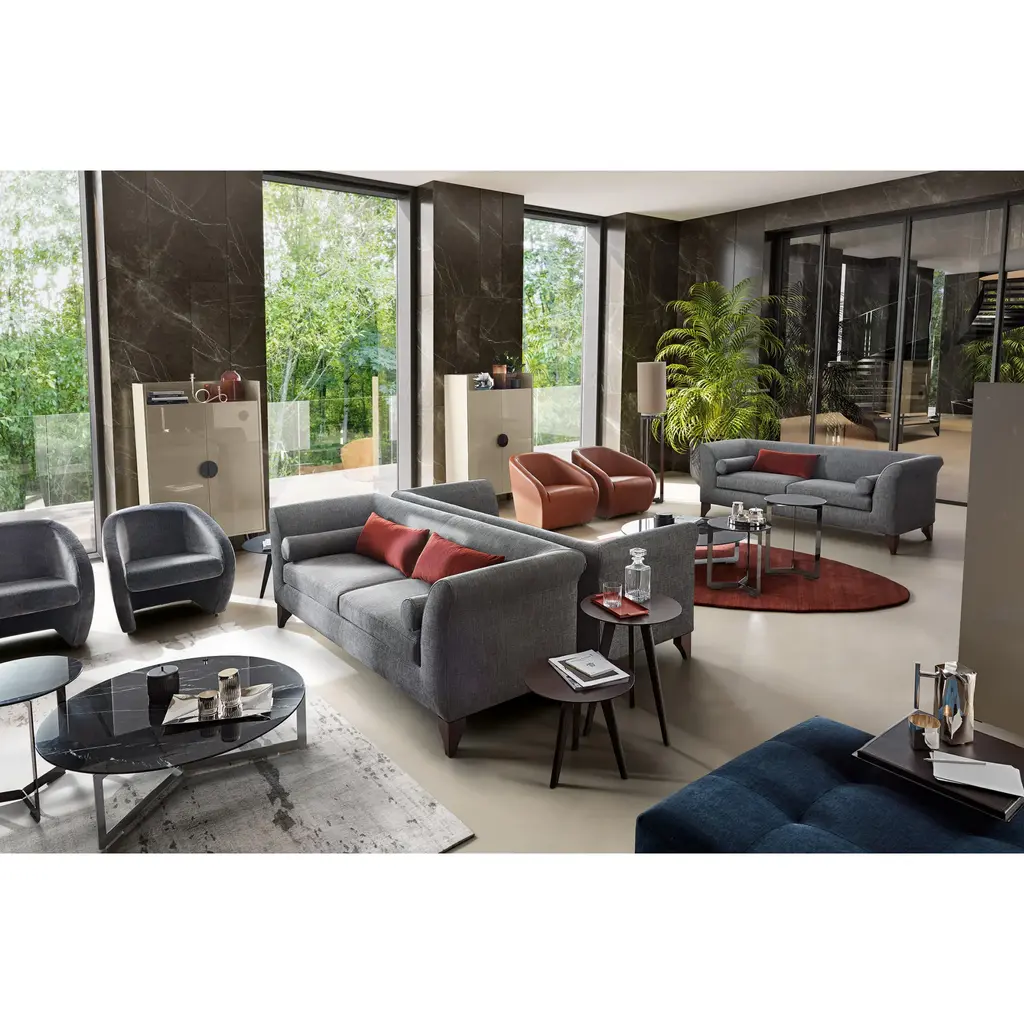 Introducing our Flared Arm Sofa and Dema Ottomanne. Luxurious in design and crafted with steel and polyurethane foam, providing unmatched comfort and support. The seat cushions are layered with thermo-bonded polyester fiber and a soft cotton lining. The feet are made of premium beech wood and finished with a rich walnut and sepia stain. Elevate your space with this elegant and exclusive set.