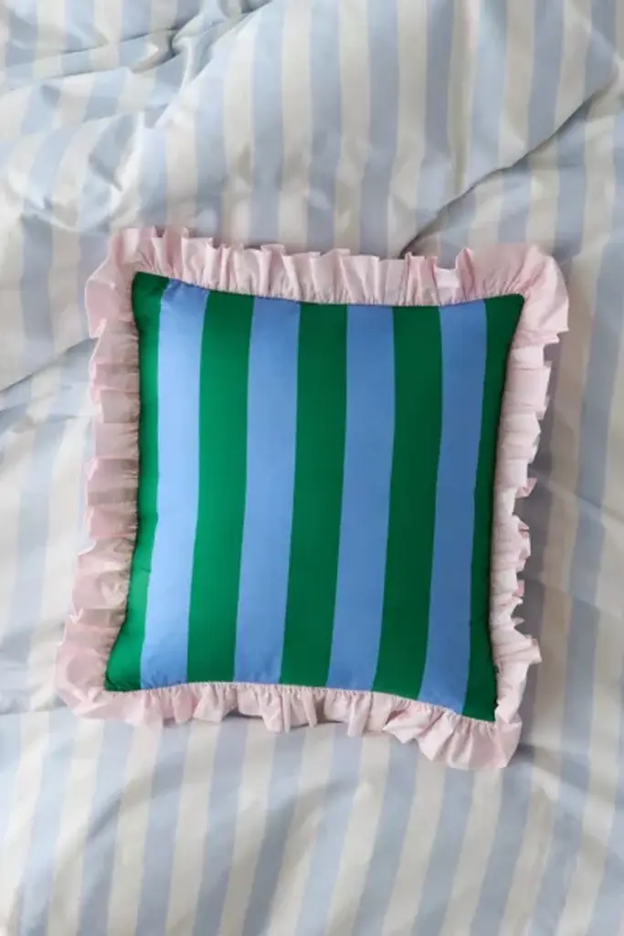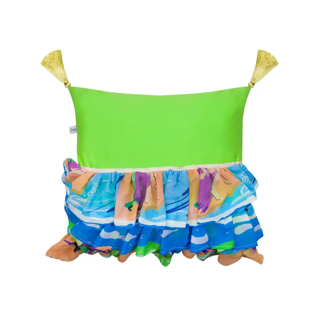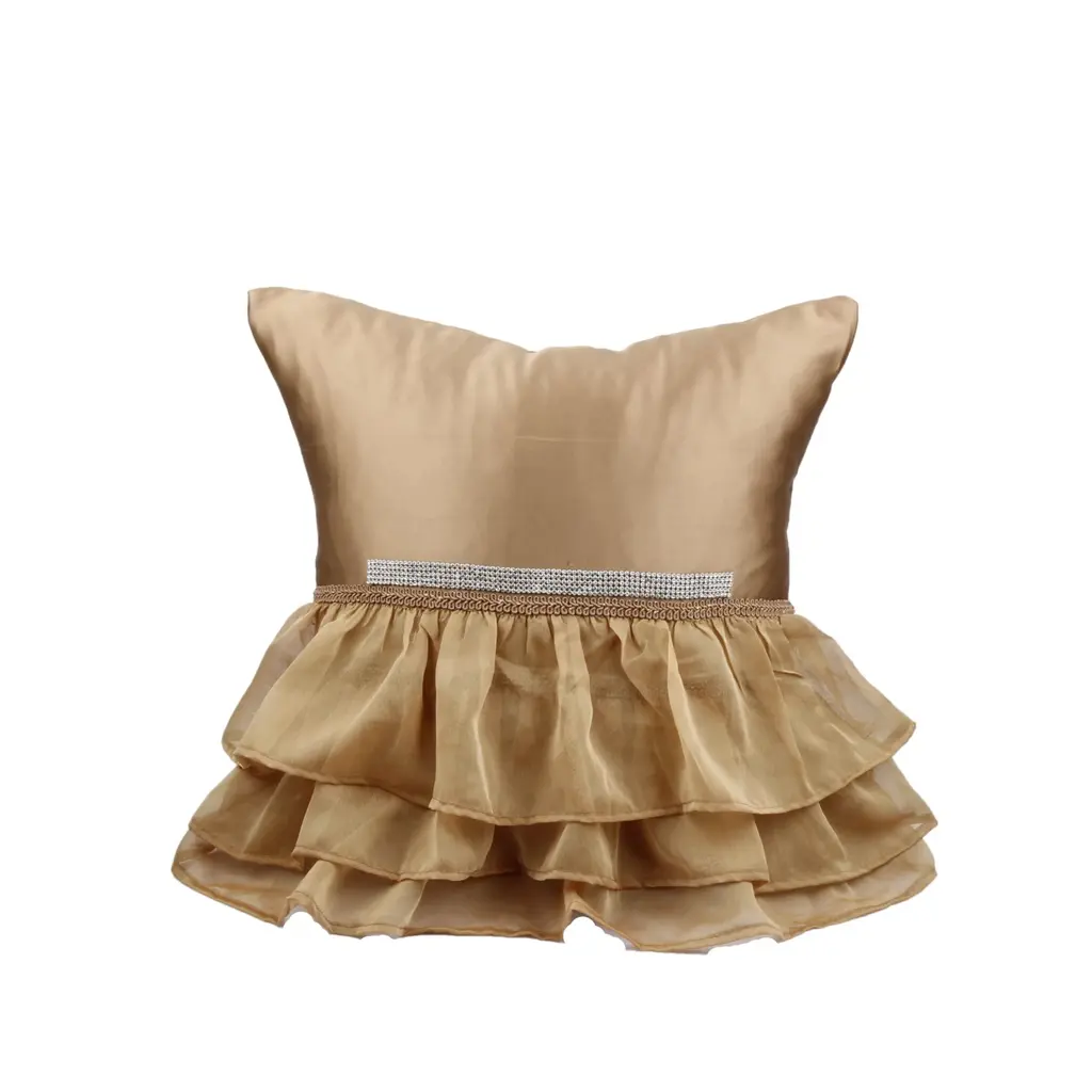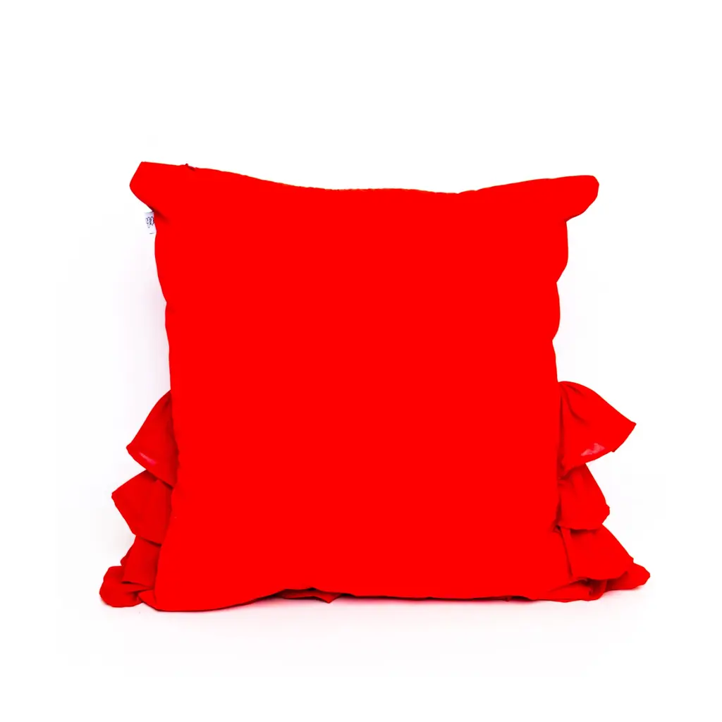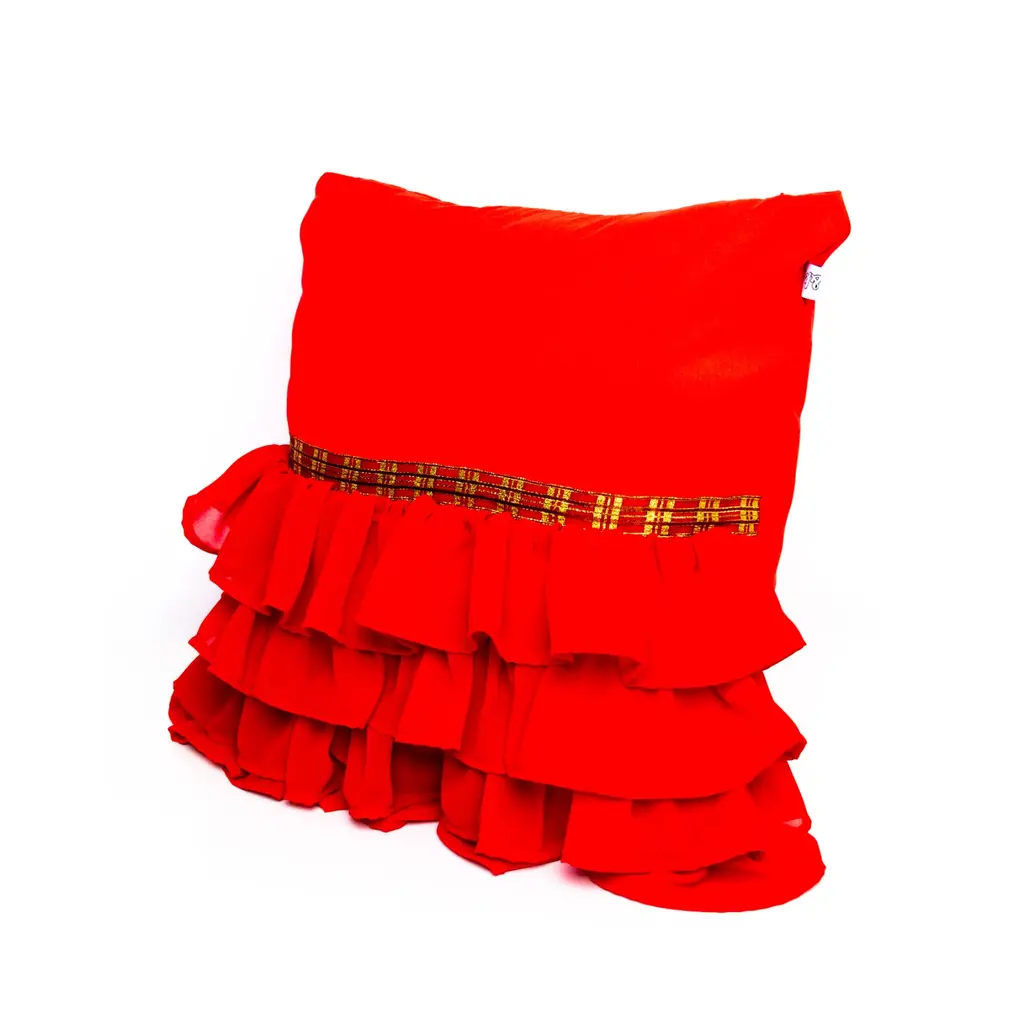 Red viscose cushion has decorative strap on. The layers of flared chiffon adds a touch. This chic cushion adds a joyful touch to your atmosphere