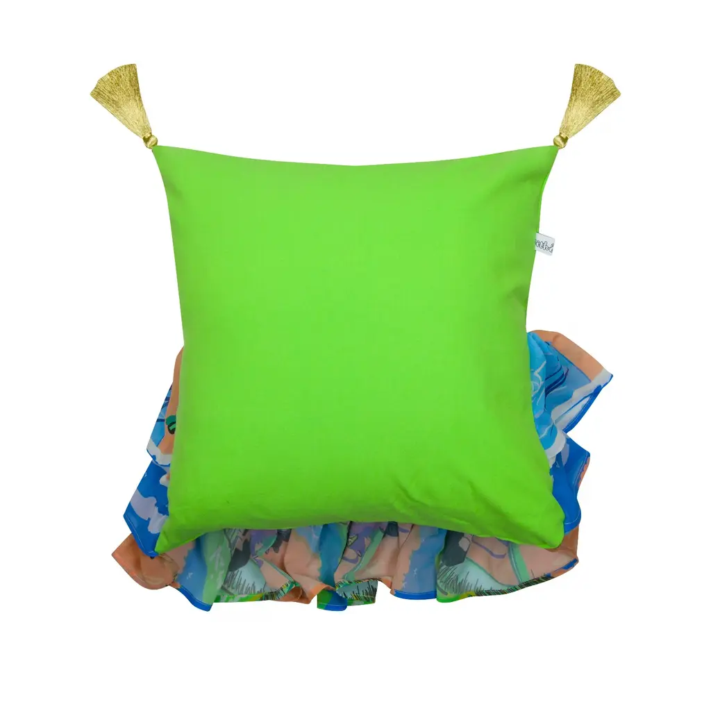 Flared chiffon layer cushion has joyful touch. The layered chiffon parts look like skirt. This playful cushion adds a touch to your living room. The cushion is closed by zip. The cushion comes with its inner cushion pad