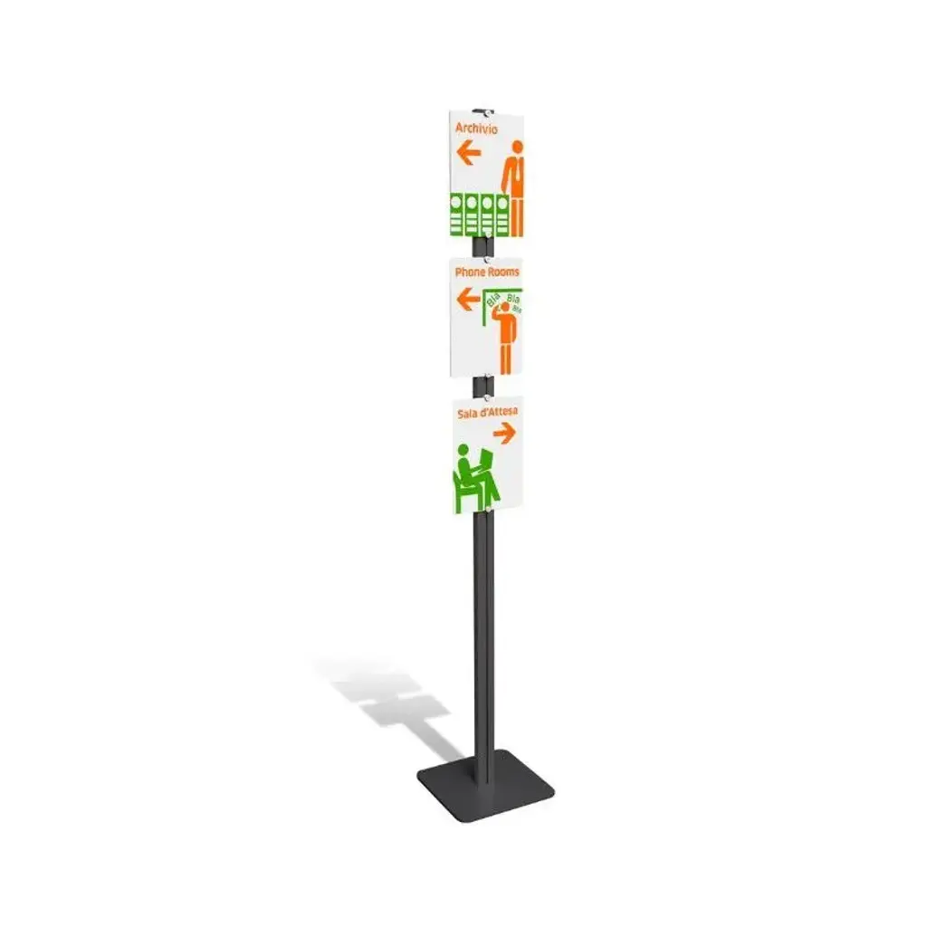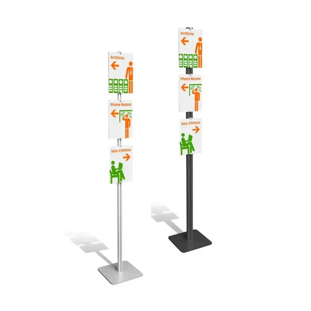 Flat Floor is a Display with a minimal and essential structure. With Flat Floor it is possible to create a display for messages, promotions, internal company signage. A product for many solutions. The structure can be produced in different finishes, while the A4 panels can be Acrylic pockets to insert messages on paper or alubond panels with graphics printed directly on the panel.Can be produced both single-sided and double-sided.InUno is a collection of divider panels, exhibition display panels, notice racks, posters, brochure racks, totems and signage, and lots of solutions. It is a line that is fully configurable in structure, size, colors, and prints to meet different style, space, and brand requirements.