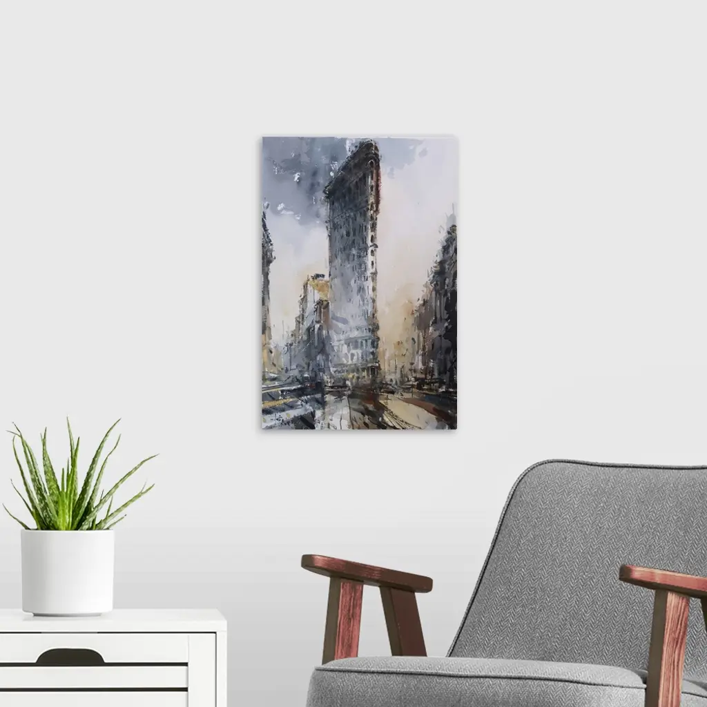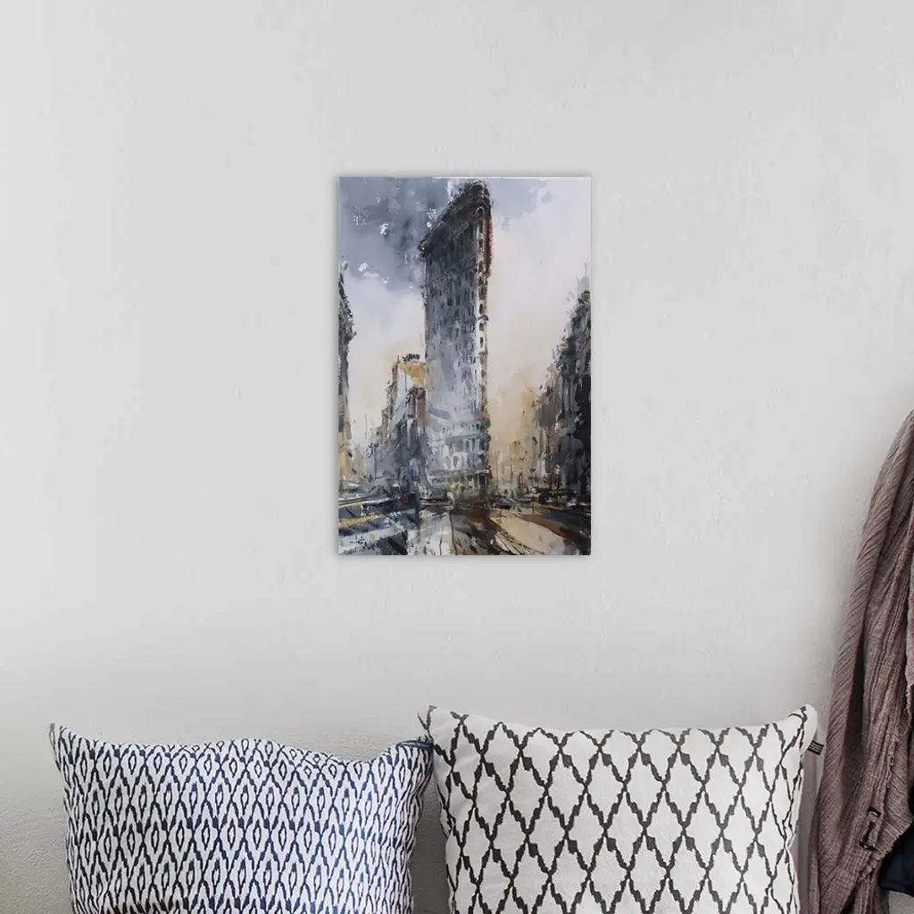 Energetic watercolor brush strokes in dark muted colors reflect the energy and weather of New York city life.