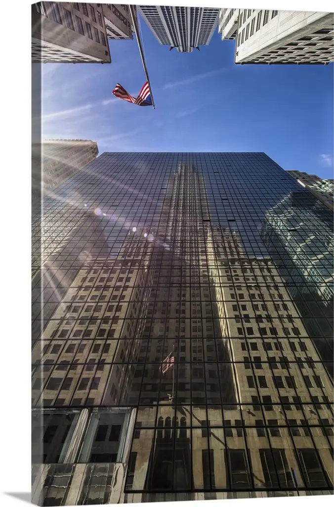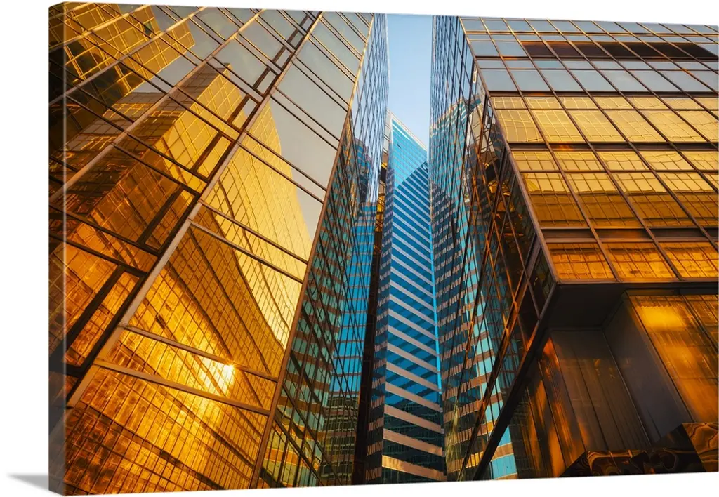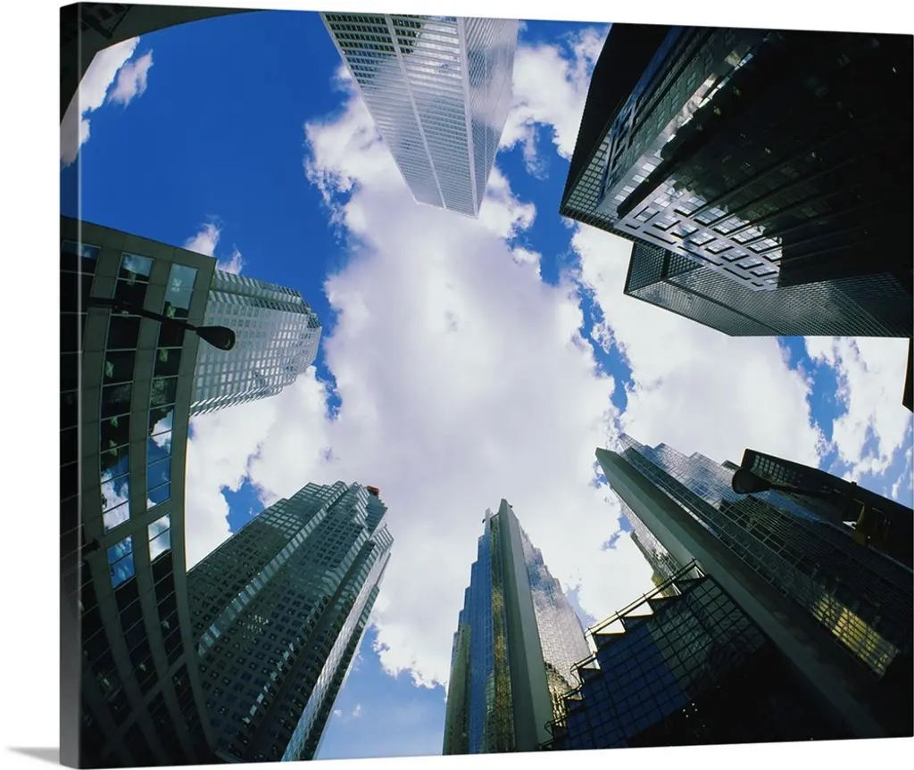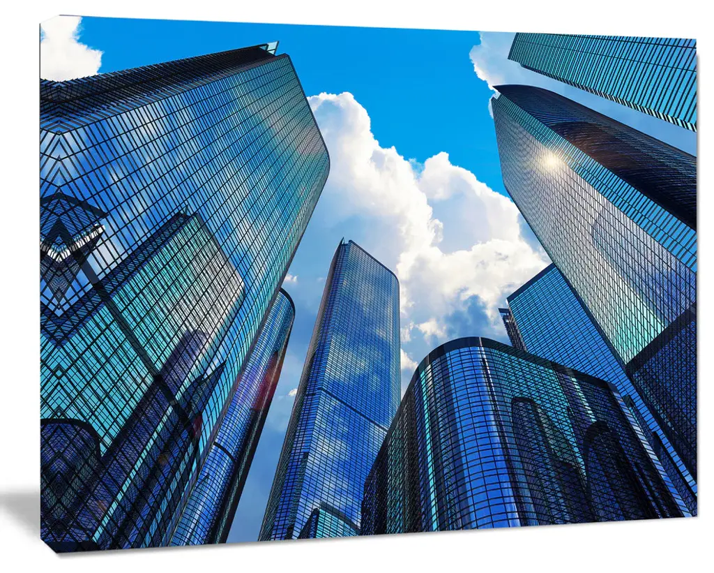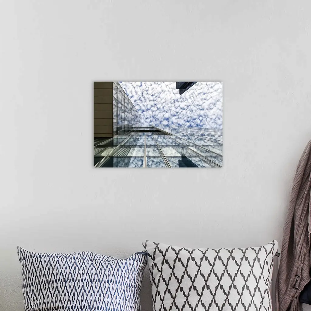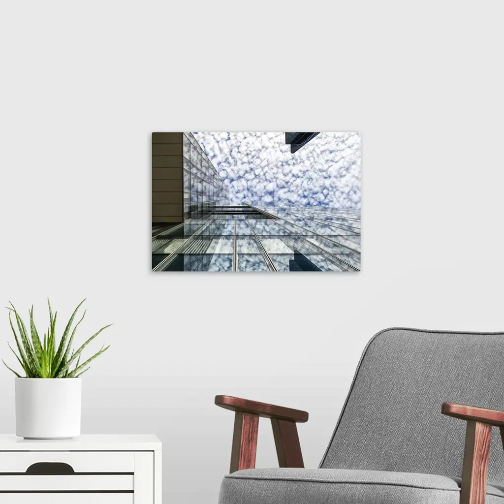 The glass facade of a skyscraper in Brussels reflecting the clouds in the sky.
