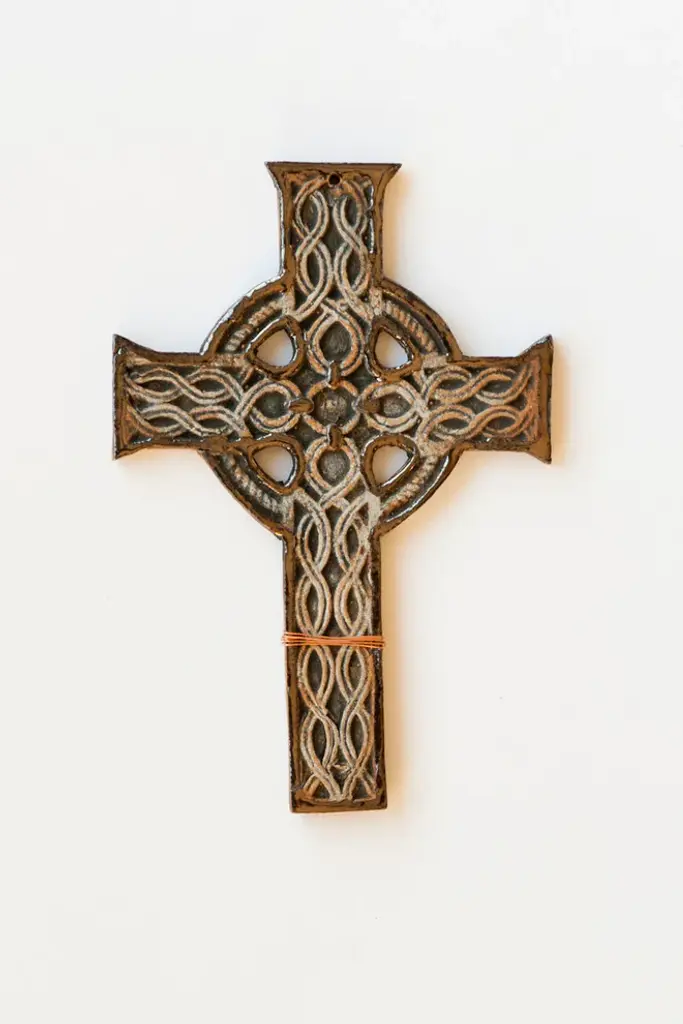 The four fleur de lis pieces on this wall cross each extend outward at the tip for a dimensional effect. At center is a floral pattern medallion. Metal is dark green, with rust and black accents. Height is 20".