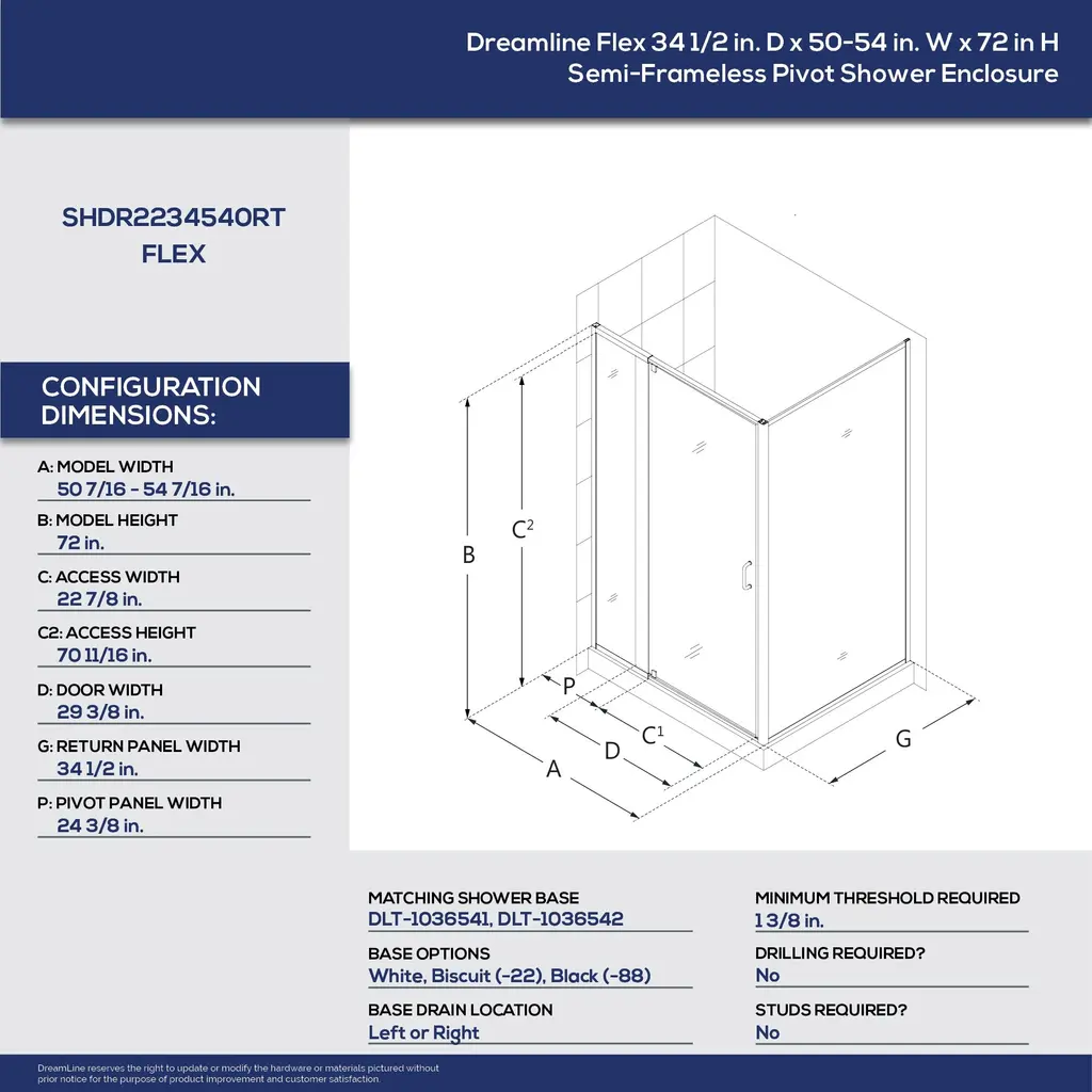 The DreamLine Flex pivot shower door or enclosure has modern appeal and a semi-frameless design that is ideal for those that want the beauty of frameless glass, but have budget or design limitations. The versatile Flex model combines cutting-edge pivot hardware and an impressive capacity for width adjustment, which simplifies installation and offers dependable performance. Complete your bathroom with the elegant and innovative look of the Flex model from DreamLine for the ultimate solution for your shower project.