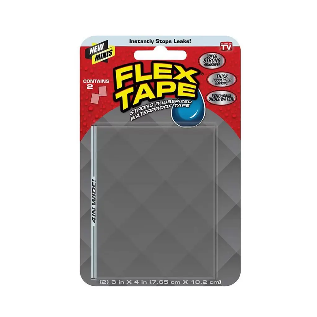 Super strong adhesive Flex Tape has a thick rubberized backing. Instantly stops leaks, even under water. Instantly creates a watertight seal to patch, bond, seal, and repair. Excellent for: home repairs and DIY projects, marine and water sports, outdoor and camping gear, automotive and mechanical, industrial and farm equipment. Repairs: roof leaks, downspouts, boats, kayaks, personal watercraft, outdoor equipment, mobile homes, vents, ducts, and more.