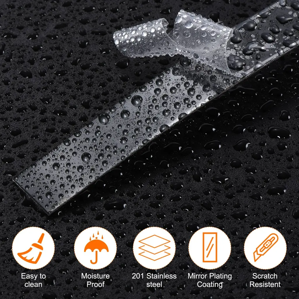 Great choice to decorate your bathroom, bedroom, kitchen, TV background wall, ceiling, border, cabinet, mirror and more.Specification:Material: 201 Stainless steelColor: BlackLength: 16.4 ft (5m) Thickness: 0.15 inch (0.4cm) Width: 0.4 inch (1 cm)Package Included: 1 set x self adhesive molding trim; 1 pcs x gloveAdvantageOur self-adhesive molding trim is made of 201 stainless steel, flexible, waterproof, corrosion-resistant and scratch-resistant, easy to clean with a wet towel.Cut the required length and shape according to the plan, cut into 45 degrees angle for corner finish. Strong self-adhesive, simply peel and stick, no glue and nails are needed.Please clean up dust and water before installation. Do not stick it on dusty or uneven walls; Use a hairdryer to heat the adhesive strips for better sticking effect before installation.Apply to any flat and smooth dry corner surface such as tile, plastic, marble, metal, glass, wood, smooth wall. and so onNote: Do not touch immediately after installation, please wait for 24 hours before use;