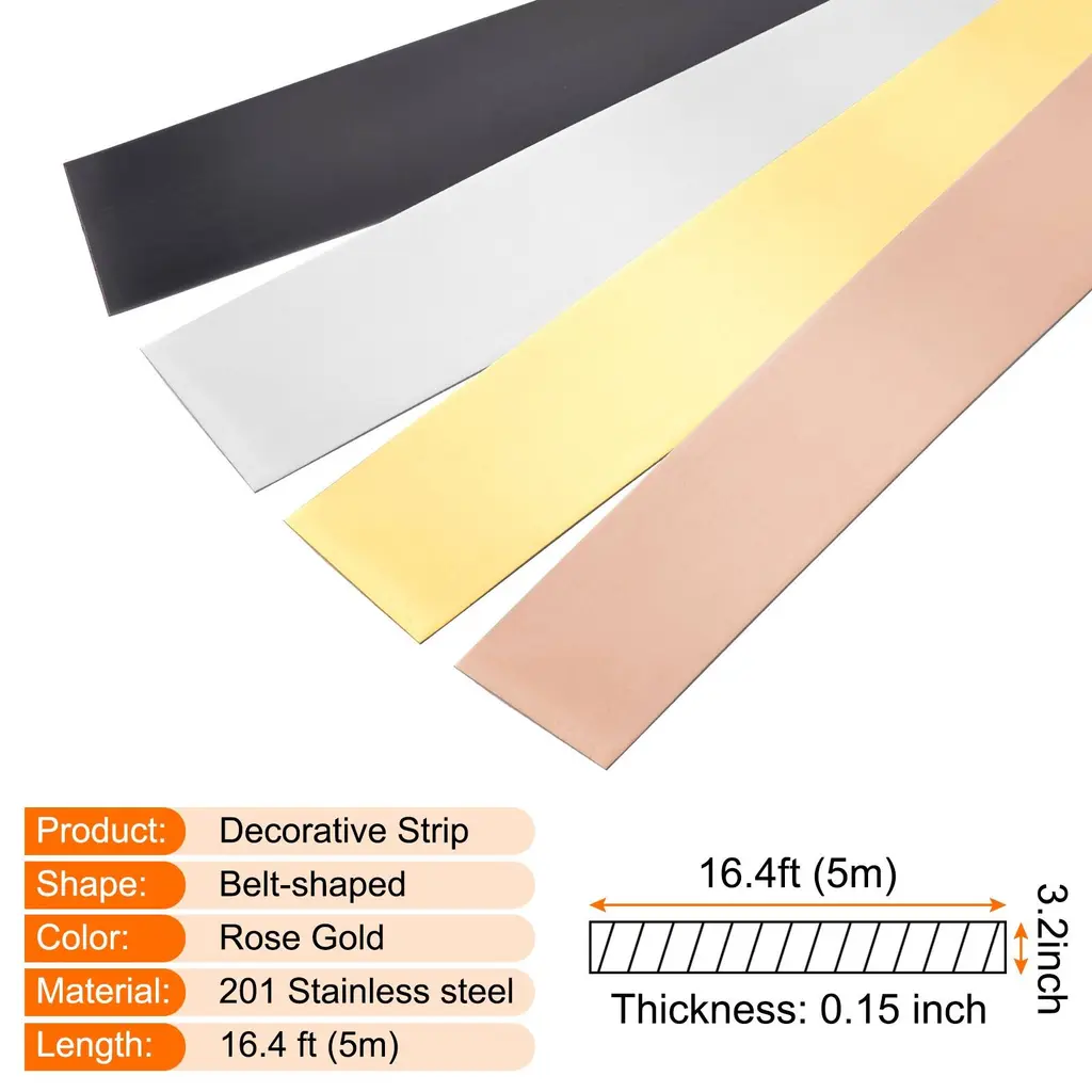 Great choice to decorate your bathroom, bedroom, kitchen, TV background wall, ceiling, border, cabinet, mirror and more.Specification:Material: 201 Stainless steelColor: BlackLength: 16.4 ft (5m) Thickness: 0.15 inch (0.4cm) Width: 0.4 inch (1 cm)Package Included: 1 set x self adhesive molding trim; 1 pcs x gloveAdvantageOur self-adhesive molding trim is made of 201 stainless steel, flexible, waterproof, corrosion-resistant and scratch-resistant, easy to clean with a wet towel.Cut the required length and shape according to the plan, cut into 45 degrees angle for corner finish. Strong self-adhesive, simply peel and stick, no glue and nails are needed.Please clean up dust and water before installation. Do not stick it on dusty or uneven walls; Use a hairdryer to heat the adhesive strips for better sticking effect before installation.Apply to any flat and smooth dry corner surface such as tile, plastic, marble, metal, glass, wood, smooth wall. and so onNote: Do not touch immediately after installation, please wait for 24 hours before use;