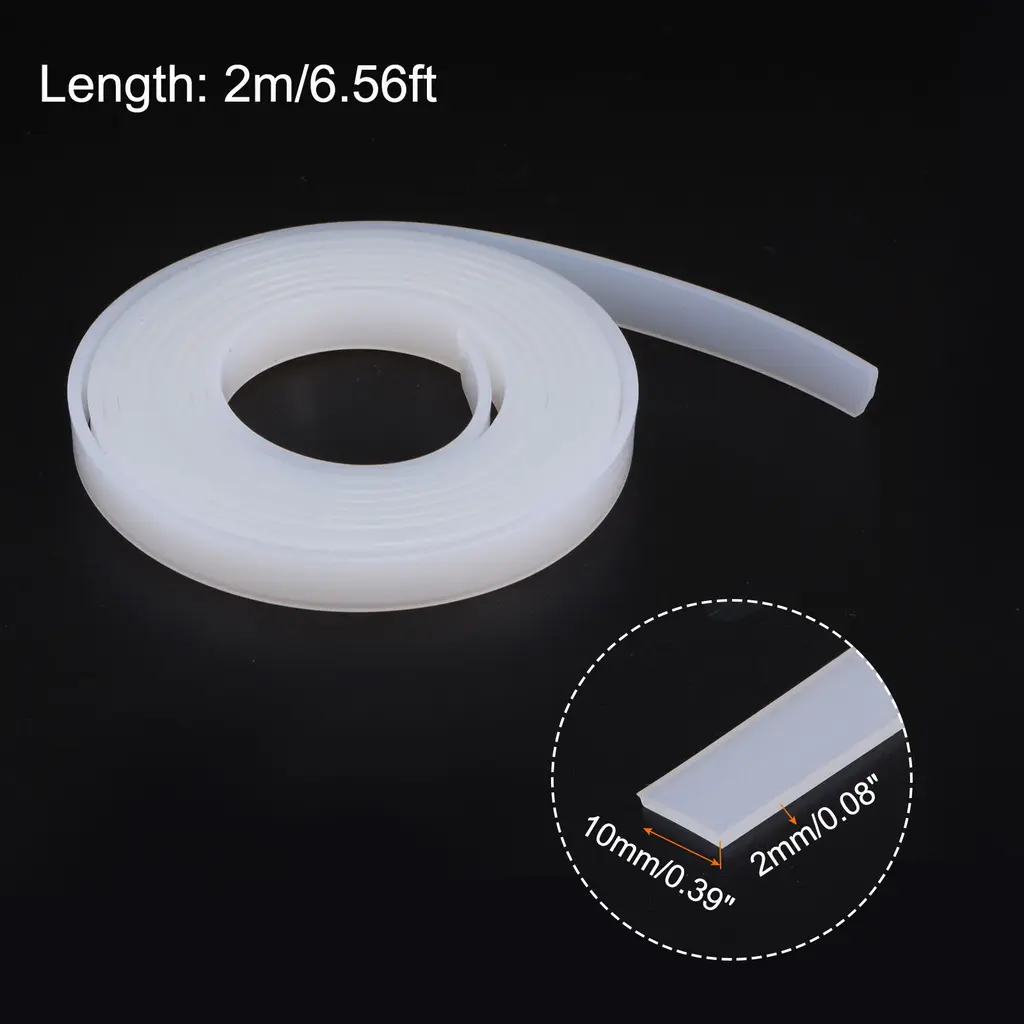 Size - Material: Silicone, Length: 2m/6.56ft, Width: 10mm/0.39", Thickness: 2mm/0.08"Material - Made of silicone, it has good resilience, shock absorption, waterproof, cushioning, anti-collision impact resistance, wear-resistant, long service life, flexibility, and other characteristics.Feature - Easy to cut with just a scissor and can be easily bent into any shape for any DIY project. It can also replace damaged silicone products of the same type.Application - Silicone strips can be used for anti-collision on the door or window side, which can reduce vibration and wear, and are also suitable for sealing, used in machinery, refrigerators, etc.Note - Please confirm the flexible solid silicone strip size you are ordering.This item is not self-adhesive and requires additional application of glue if required.The rectangular silicone strip can be used as a sealing and anti-collision strip. It has a smooth appearance, is soft and elastic, and is not accessible to age and deform.Made of silicone, it has good resilience, shock absorption, waterproof, cushioning, anti-collision impact resistance, wear-resistant, long service life, flexibility, and other characteristics.Silicone strips can be used for anti-collision on the door side, which can reduce vibration and wear, and are also suitable for sealing, used in machinery, refrigerators, etc.Easy to cut with just a scissor and can be easily bent into any shape for any DIY project. It can also replace damaged silicone products of the same type.Notice: Please confirm the flexible solid silicone strip size you are ordering.This item is not self-adhesive and requires additional application of glue if required.