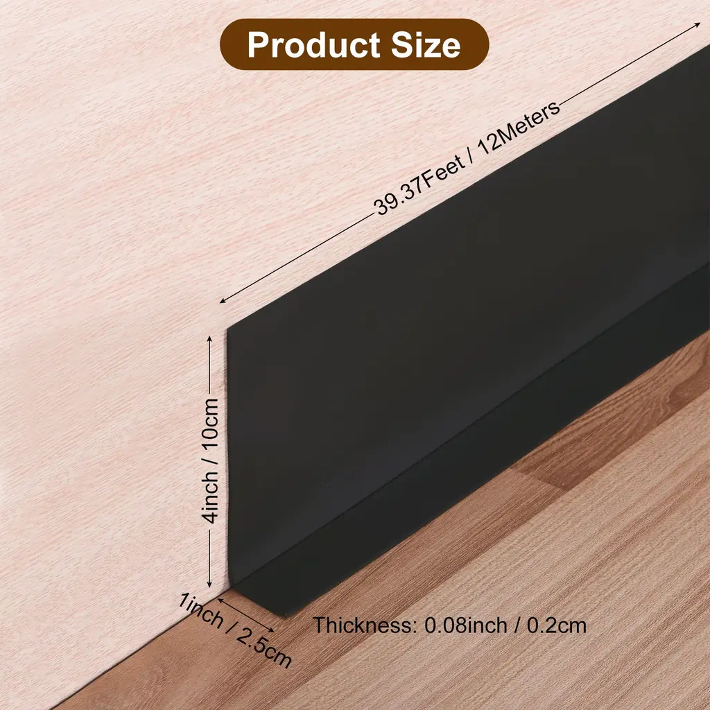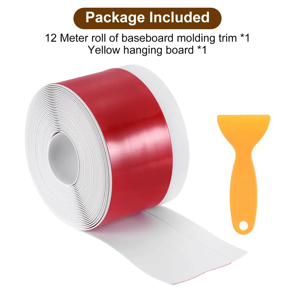 Baseboard molding trim for covering gaps between floors and walls in garage, living room, bathroom, bedroom, RVs, kitchen, during house renovations.Specification:Material: PVCColor: WhiteLength: 39.37Ft/12mWidth: 5in/12.5cmThickness: 0.08 inch/0.2 cmPackage Included: 1 x roll of baseboard molding trimAdvantage:The wall baseboard molding is made from PVC material, flexible, wear-resistant, and not easy to fade or deform even with prolonged use.It features a toe design that deals with various situation, especially helping you hide various flaws and uneven surfaces.Just simply clean the wall surface, then cut the length of the wall base you need then apply glue on the wall base for installation.This wall base molding trim has a smooth and even finish, making it easy to clean. Just give it a wipe with a damp cloth and dry it off.Note: For temperatures below 68°F, use a hair dryer to warm the adhesive strip for optimal performance.