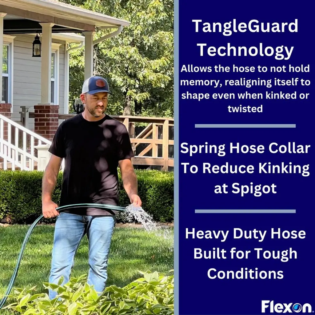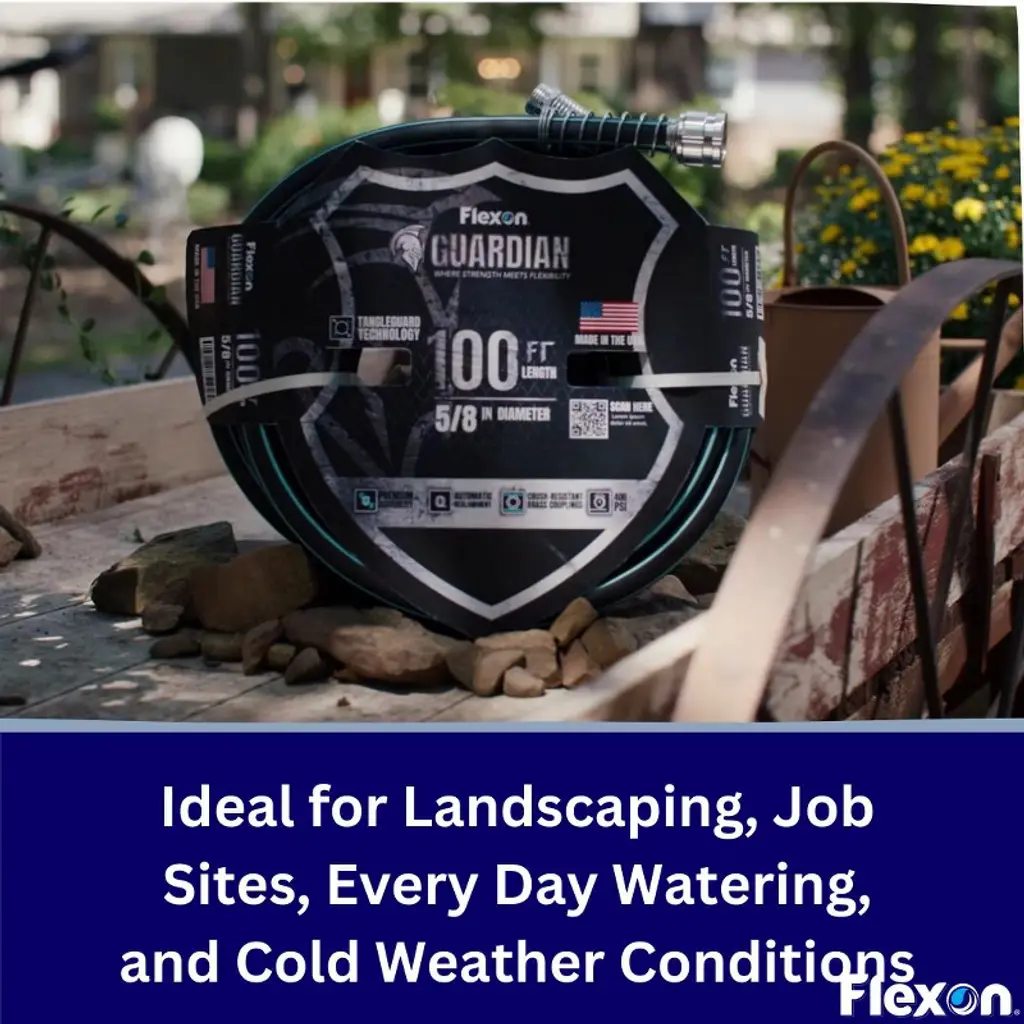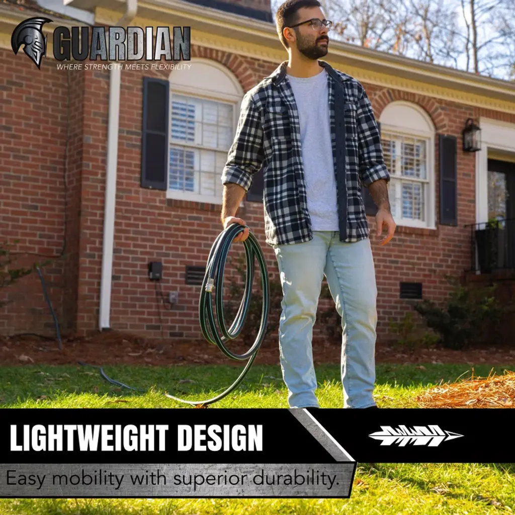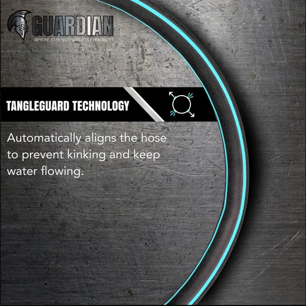 Meet the Guardian, the new and innovative hose changing the garden hose industry. This hose is not like your other hoses, with the Tangleguard Technology, this hose will bounce back to its true shape with no memory. Whether you kink it, tie it, or run over it this hose will snap back and keep the water flowing. Not only that but this hose features crush proof brass couplings for added durability and a spring hose collar to reduce kinking at the spigot. This hose is built to last and proudly made in the USA with globally sourced components. Choose flexibility, choose strength, choose the Guardian.