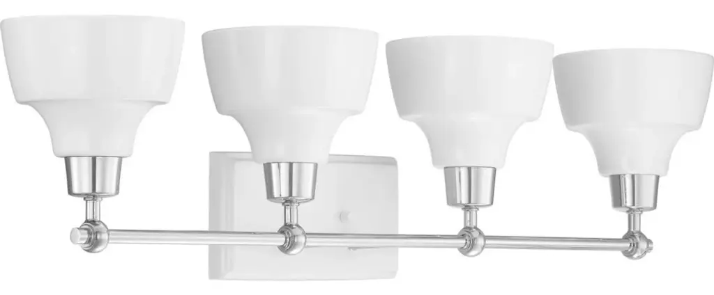 The four-light Flight bath and vanity features a variety of industrial modern elements, including a linear frame and circular wall plate. The geometric and linear design is complemented by etched glass shades and a Polished Chrome finish. Fixture can be installed with glass facing up or down.