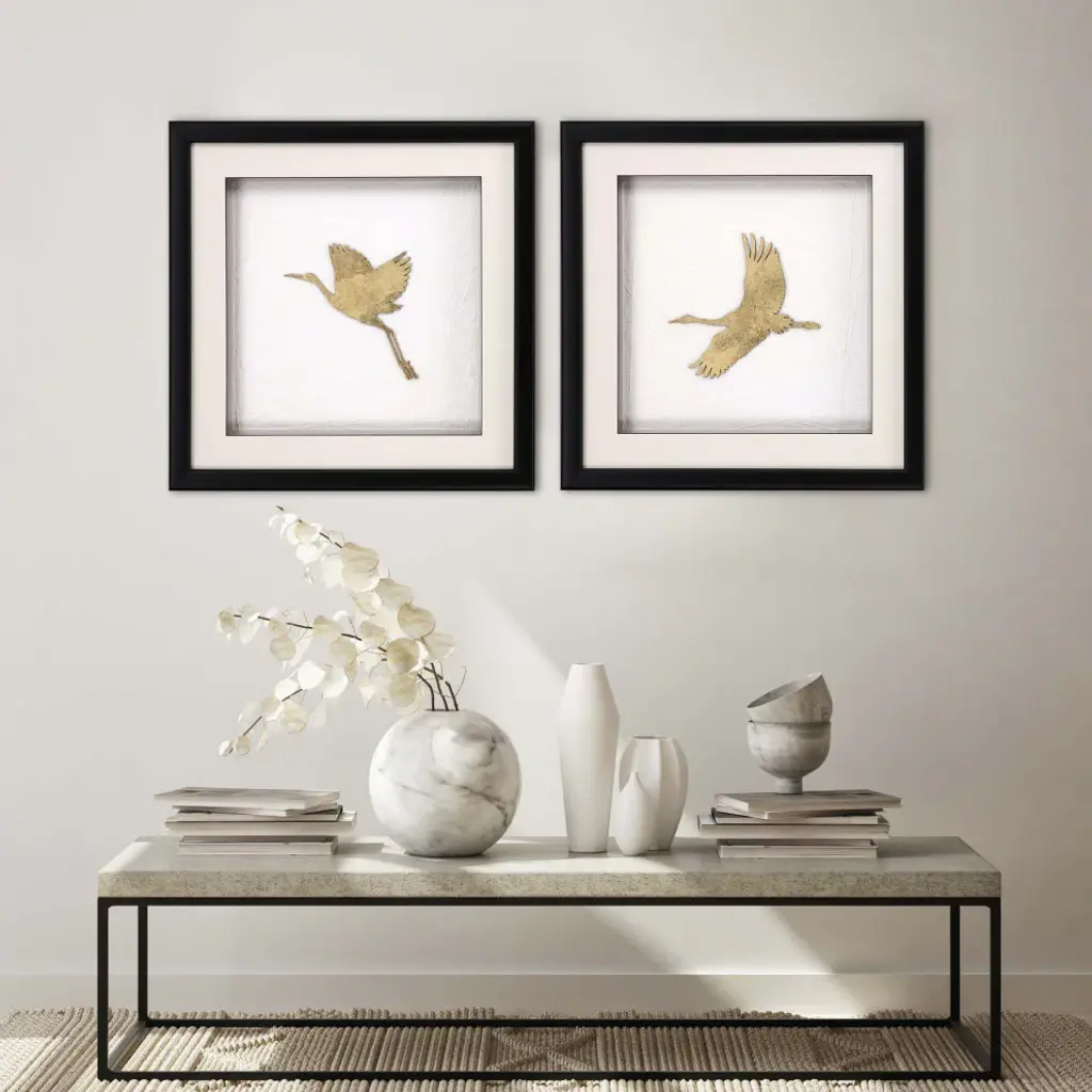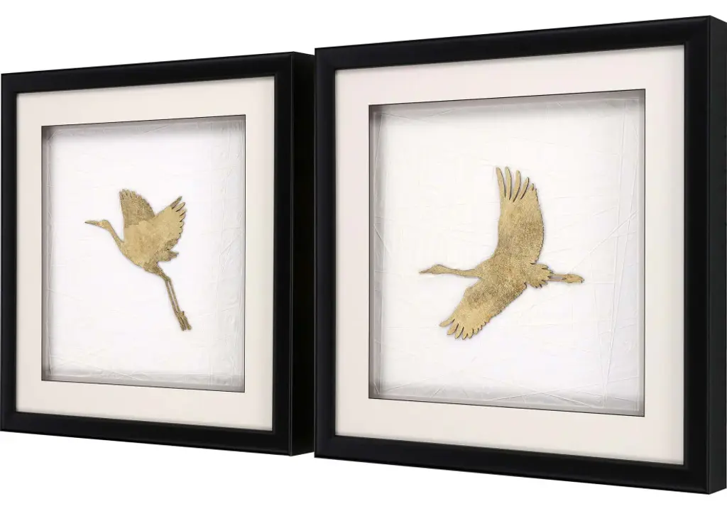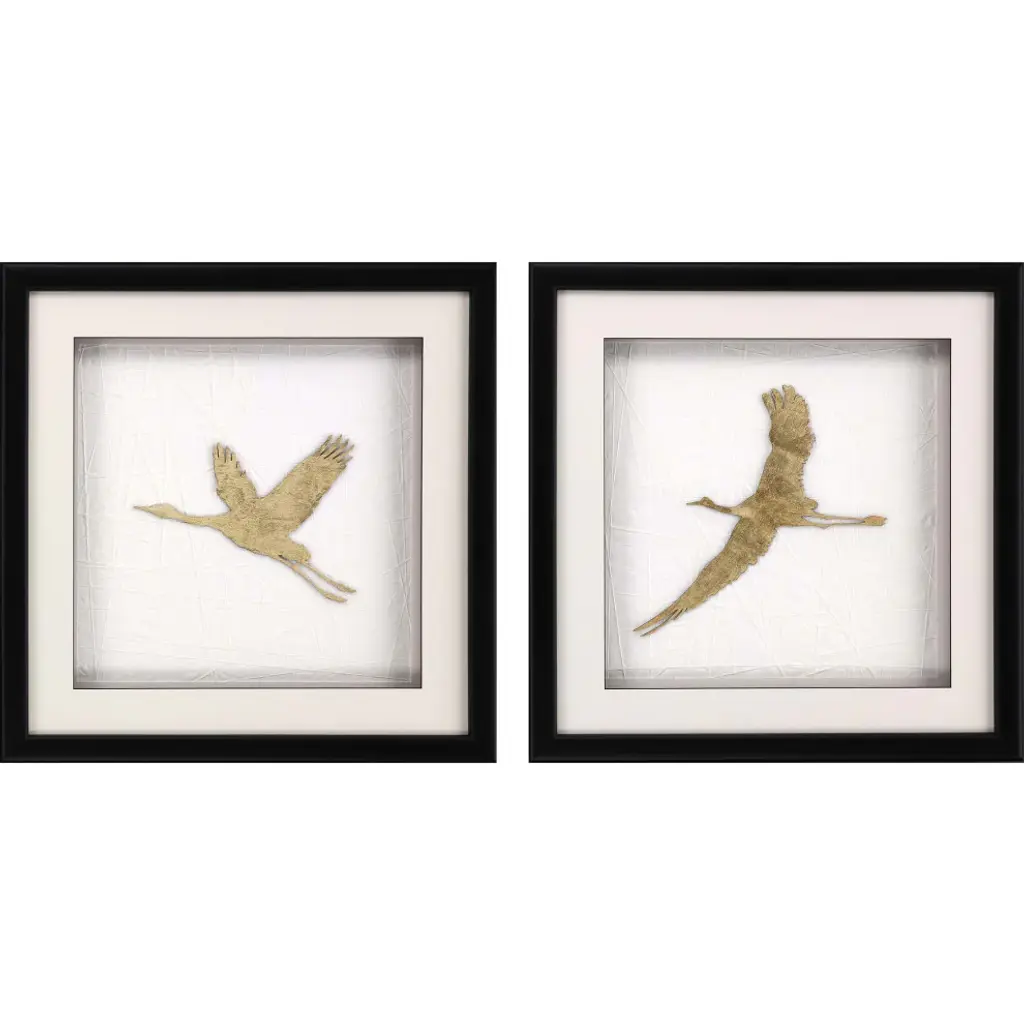 Exclusive mixed media with hand applied gold leaf on laser-cut cranes. Framed in a black matte wood shadow box with rounded edges.