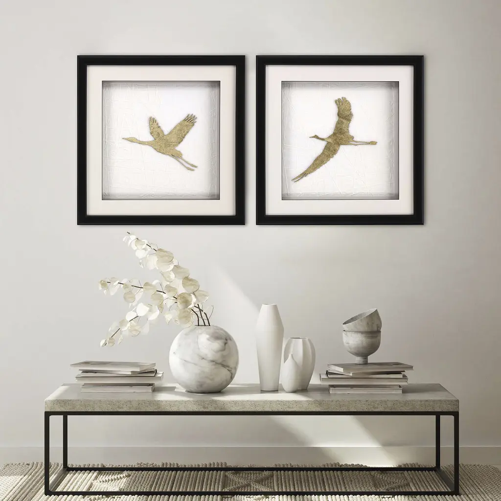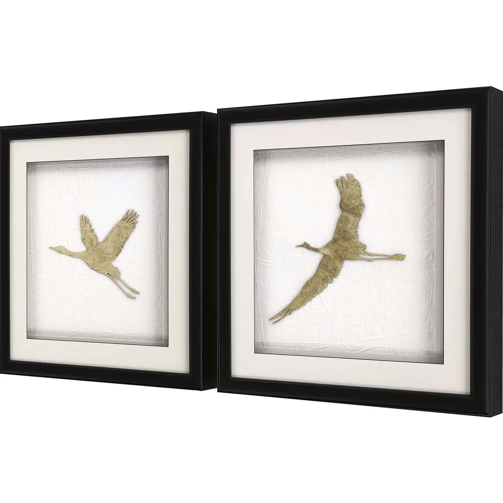 Exclusive mixed media with hand applied gold leaf on laser-cut cranes. Framed in a black matte wood shadow box with rounded edges.