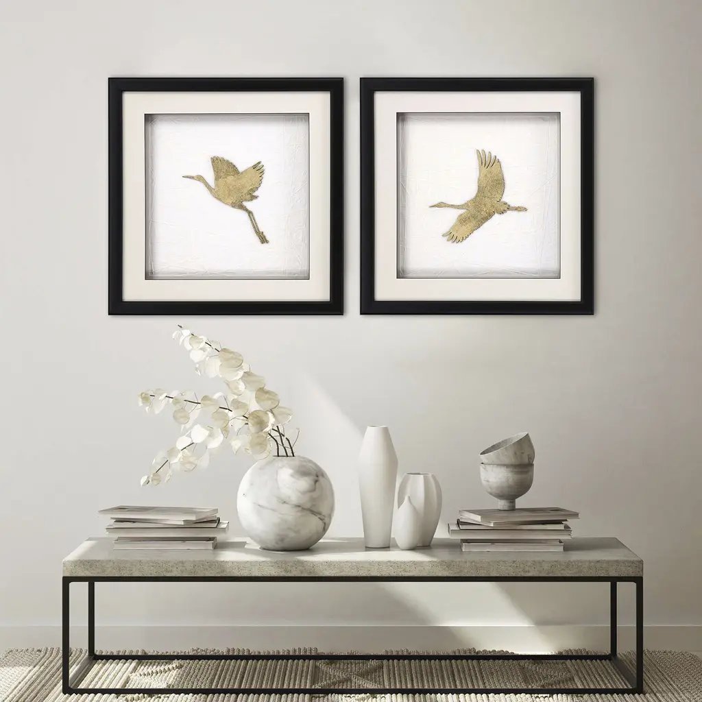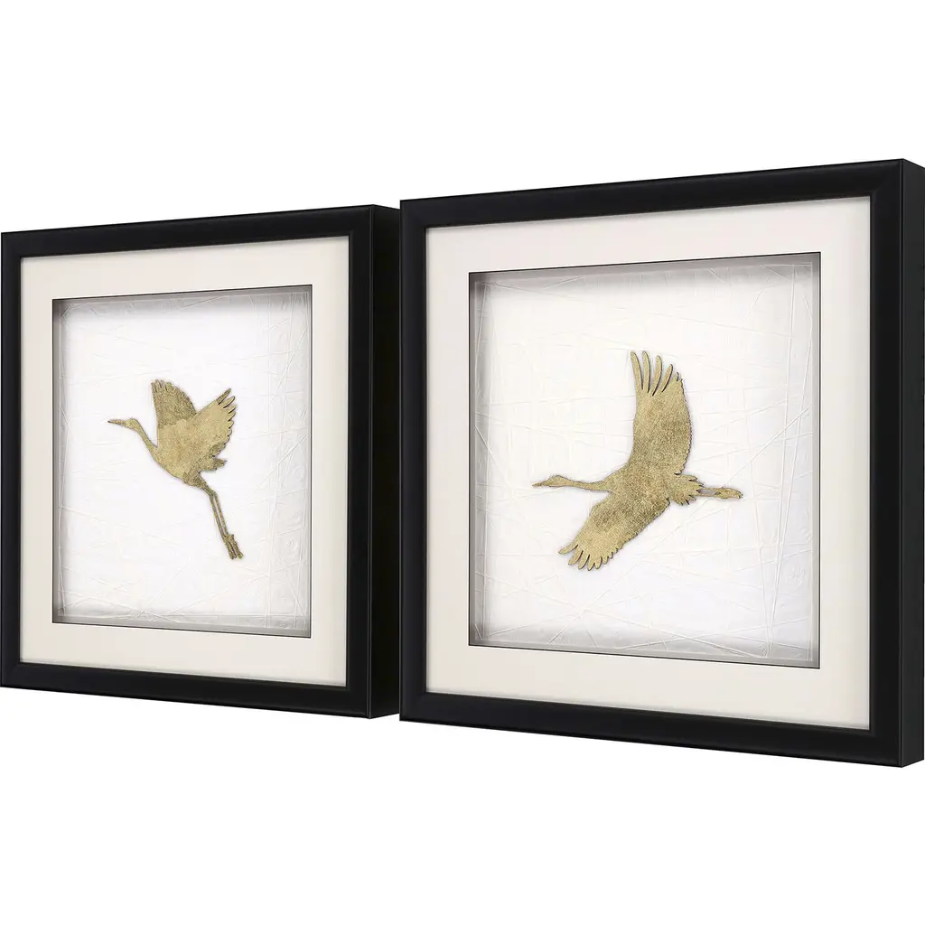 Exclusive mixed media with hand applied gold leaf on laser-cut cranes. Framed in a black matte wood shadow box with rounded edges.
