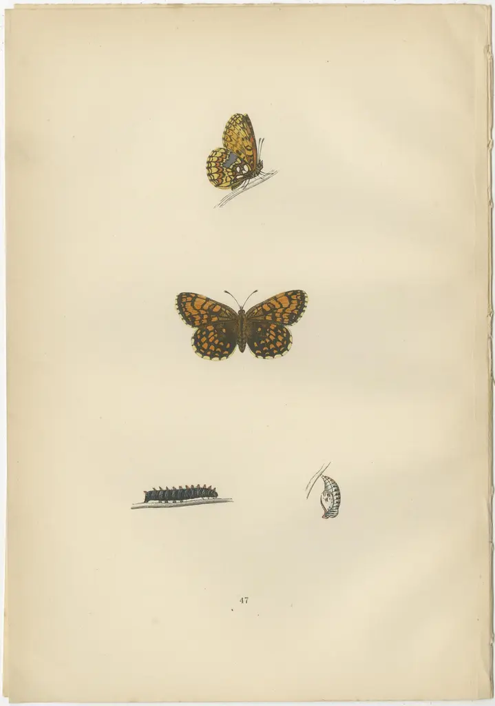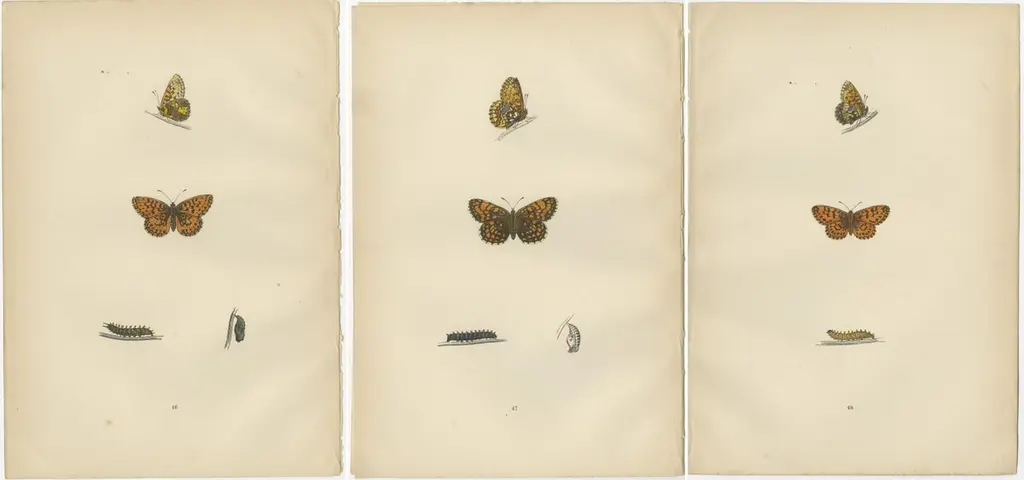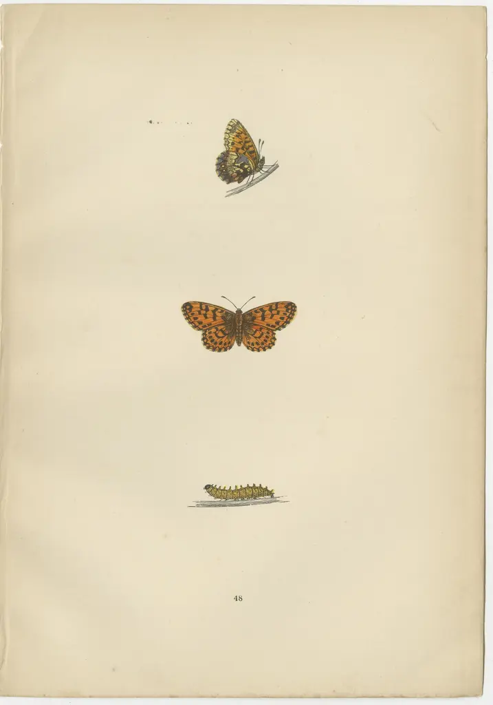 The three butterflies - the Small Pearl-Bordered Fritillary, Pearl-Bordered Fritillary, and Weaver's Fritillary - are all part of the Fritillary family, known for their distinctive orange-brown wings with black or dark brown spots. Here's a brief description of each:1. Small Pearl-Bordered Fritillary (Boloria selene): This butterfly is characterized by its orange-brown wings with black spots and a series of small white 'pearls' on the outer edges, which gives it its name. The undersides of the wings have additional intricate patterns with more prominent white pearls and a metallic sheen. It's found in damp grasslands and woodlands and is fascinating because of its close resemblance to the Pearl-Bordered Fritillary, which can make it quite challenging to identify.2. Pearl-Bordered Fritillary (Boloria euphrosyne): Similar to the Small Pearl-Bordered Fritillary but generally larger, the Pearl-Bordered Fritillary has a more pronounced row of white 'pearls' along the outer edge of its hindwings, from which it gets its name. The spaces between the black spots on the upper wings are brighter, and the black borders are usually thinner. This species prefers woodland clearings and is interesting because it's one of the earliest fritillaries to emerge in spring.3. Weaver's Fritillary (Boloria dia): Also known as the Violet Fritillary, it is less common in the UK. The Weaver's Fritillary has more subdued coloring, with less contrast in the spots and a less distinct pearl border. This species prefers flowery grasslands and can be found in Europe, primarily in the southern regions, making it less common and therefore quite intriguing to butterfly enthusiasts in the UK.What makes these butterflies particularly interesting is their survival and adaptation strategies; they have specific habitat requirements and are sensitive to environmental changes. Their presence and numbers can indicate the health of an ecosystem. Additionally, their lifecycle, which includes transformation from caterpillar to the adult butterfly stage, is a beautiful representation of metamorphosis, making them a subject of fascination for both scientists and nature lovers. These hand-colored plates from Morris's "A History of British Butterflies" capture not only the beauty but also the scientific detail that aids in their study and conservation.
