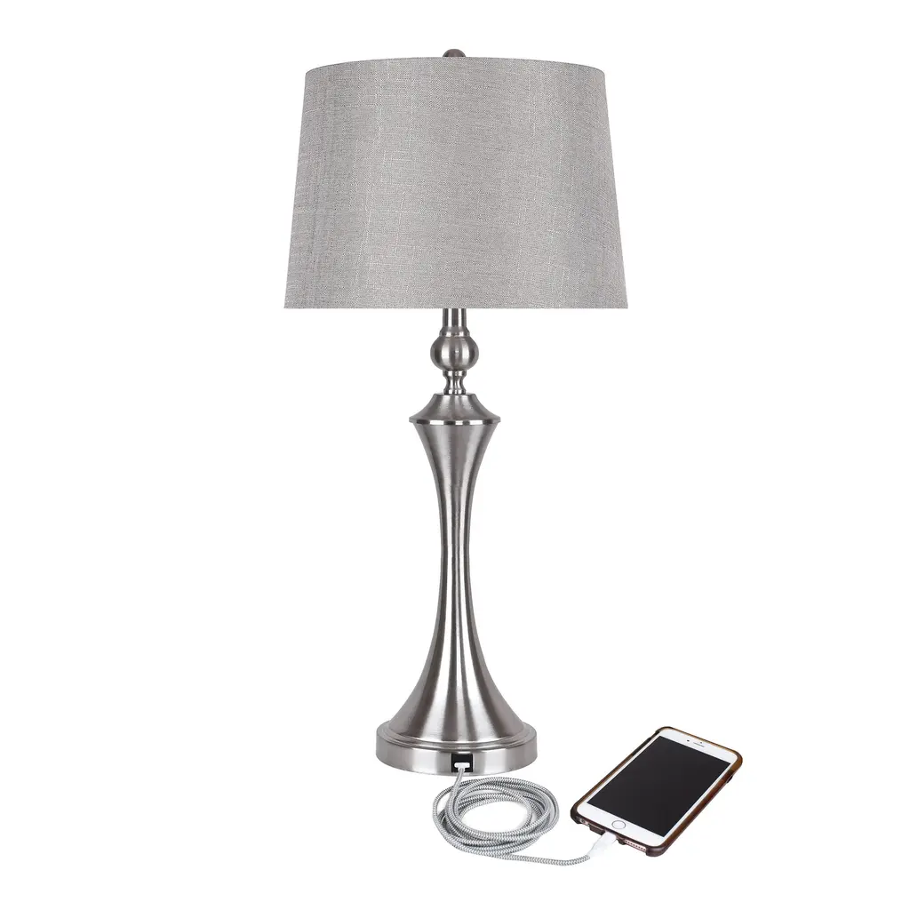 The perfect blend of style and function, this set of modern metal table lamps by Grandview Gallery features an hourglass-shaped body with a small orb resting above it, with the convenience of a USB port located within easy reach on the lowest part of the round base. Topped by a tapered linen shades and matching metal finials, these lamps don't sacrifice beauty for the sake of utility. They are perfect for bedside tables, next to a couch, or atop a desk, where they will add a practical and stylish touch. Set of two lamps, each is 31" tall. Round bases are 7" wide. Hardback tapered drum shades are 15" at their widest and are 10" tall. Each lamp uses one 100-watt maximum "A" bulb and features an E26 socket with a 3-way rotary switch.