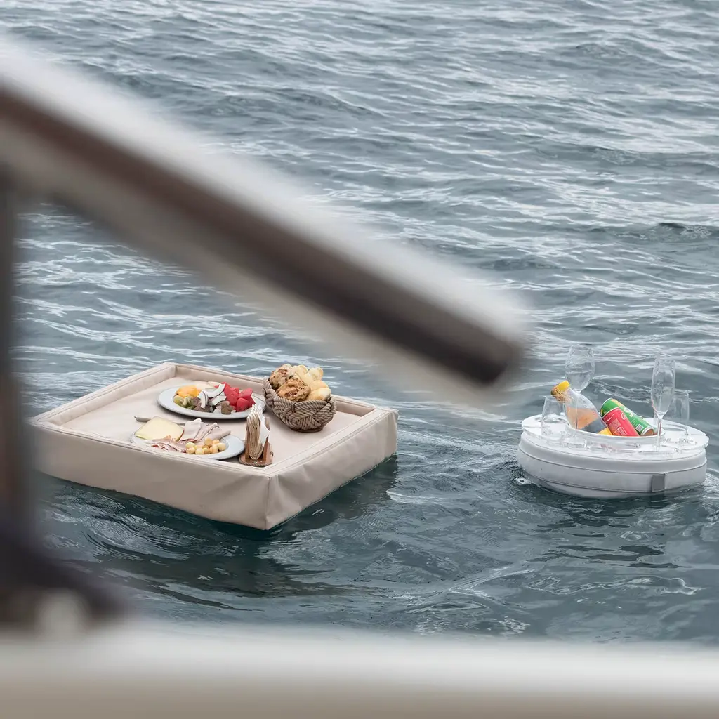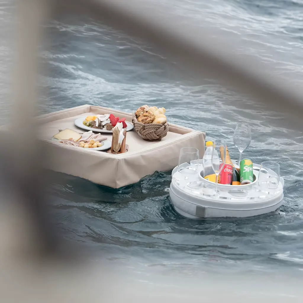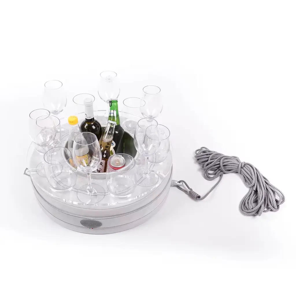 This floating glass holder holds twelve glasses — six long drinks and six wine glasses or champagne flutes. Entertain adults and kids while out on the water serving beer, champagne, wine, water and soft drinks. It can be anchored or towed, and includes a 15 meter tow rope with carabiner. Made from closed cell foam, waterproof fabric, aluminum and plexiglass.