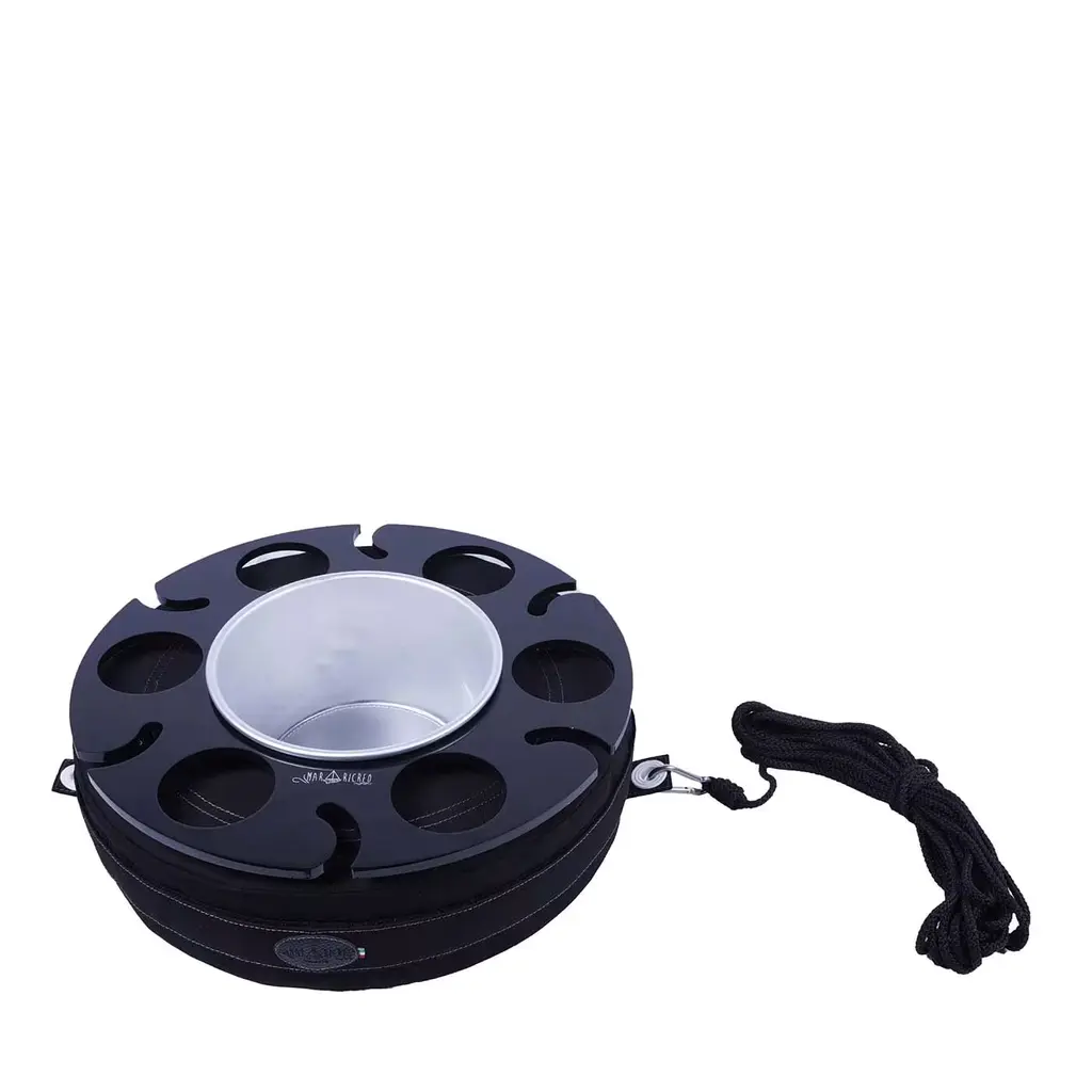 This floating drinks holder can be anchored or towed and includes a includes a 15 meter tow rope with carabiner. It holds twelve glasses — six long drinks and six wine glasses or champagne flutes, so you can entertain adults and kids out on the water with beer, champagne, wine, water and soft drinks. Made from closed cell foam, waterproof fabric, aluminum and plexiglass.