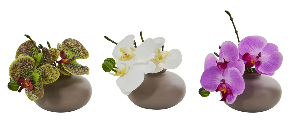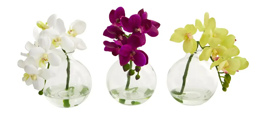 Fuchsia phalaenopsis orchids in faux water are in clear vases upon a black wood base.