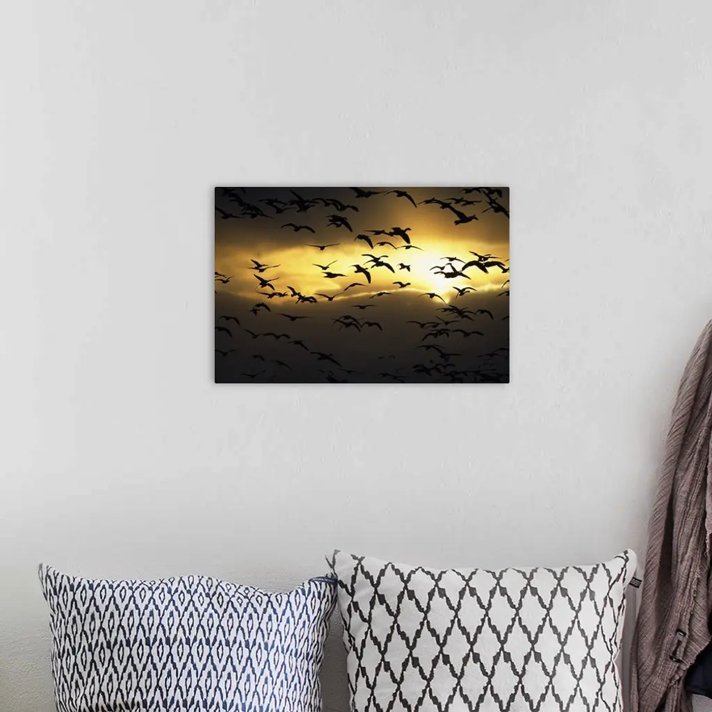 Flock of silhouetted snow geese in flight, sunrise, Bosque Del Apache, New Mexico wall art for home and office decor. Discover canvas art prints, photos, mural, big canvas art and framed wall art in GreatBigCanvas.com's varied collections.