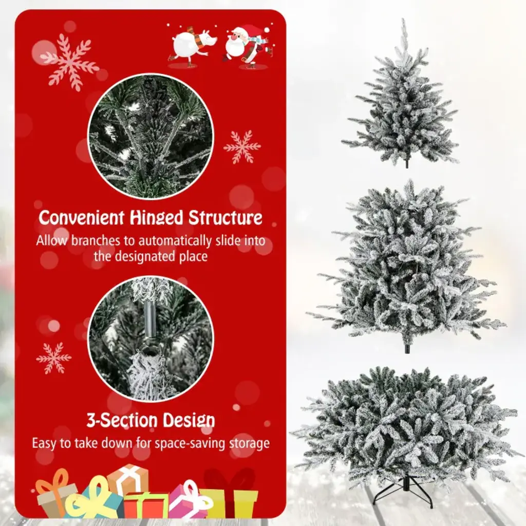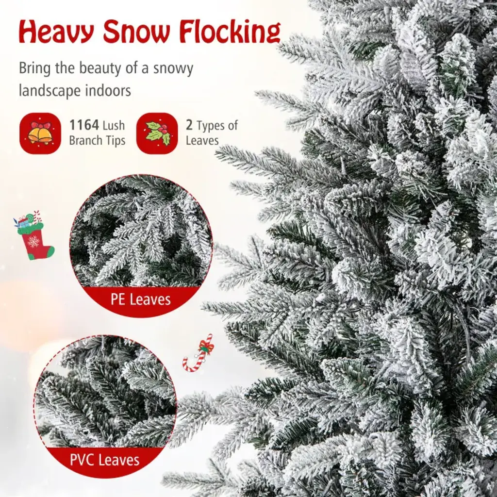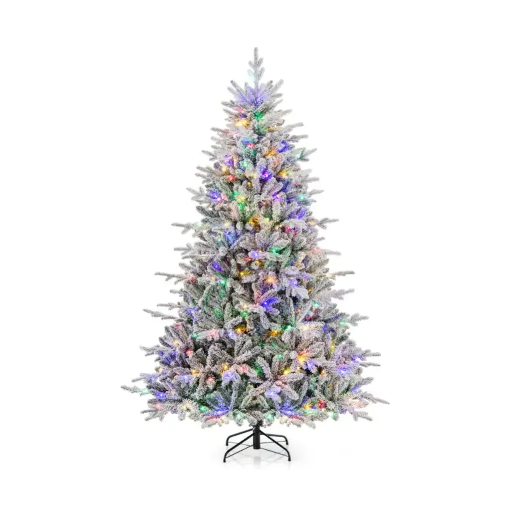 Specifications:Description:Illuminate your holidays with this enchanting Christmas tree, available in 4.5, 6, or 7 feet tall and featuring 160, 260, or 350 multi-color LED lights that cast vibrant hues for a magical ambiance. With 8 lighting modes including combination, waves, and slo glo, you can easily tailor the display to your festive mood or event. Its lush appearance is enhanced by 436, 820, or 1164 branch tips with a flocked design that mimics fresh snowfall, making it a versatile decoration for any setting. Made from premium PVC and PE materials, the tree is fireproof, anti-fading, and odorless, ensuring durability and long-lasting beauty. The hinged structure and folding metal stand allow for quick and easy assembly and disassembly, providing a hassle-free holiday decorating experience.Key Features: