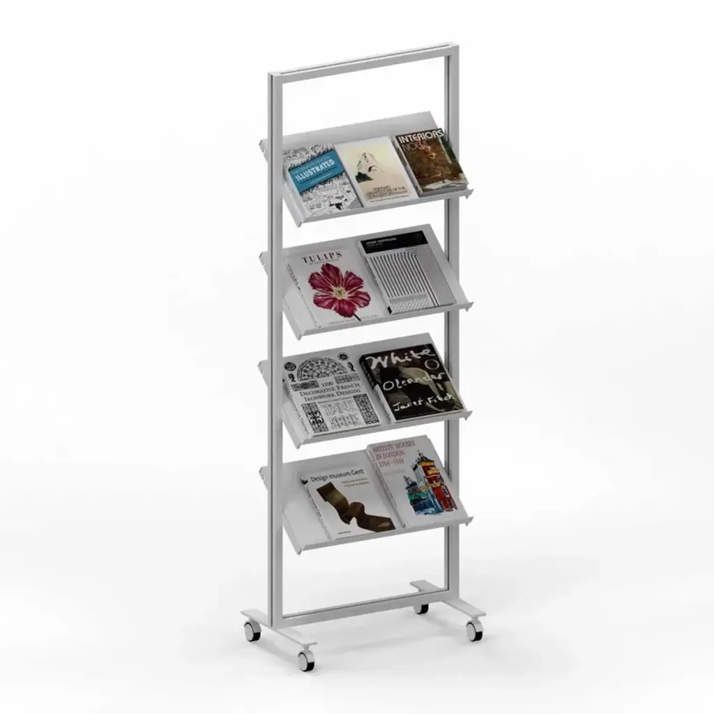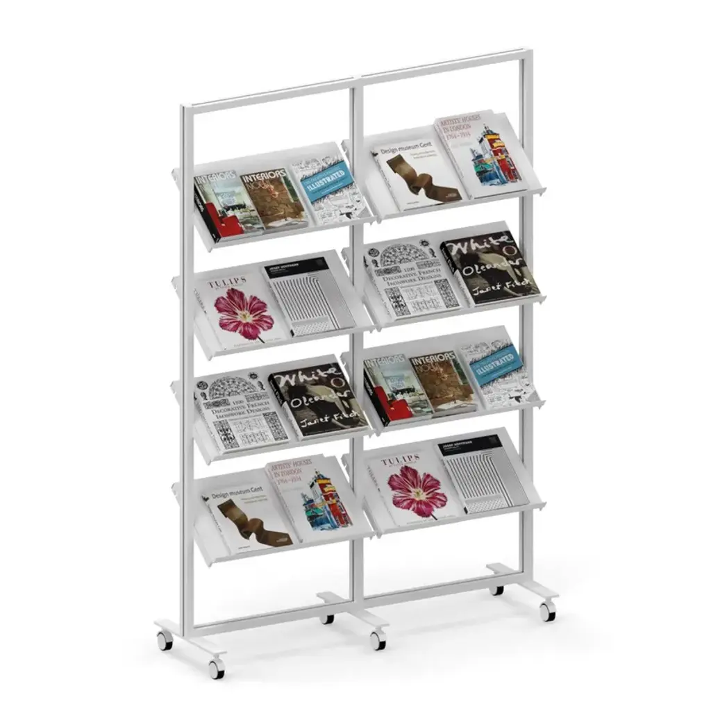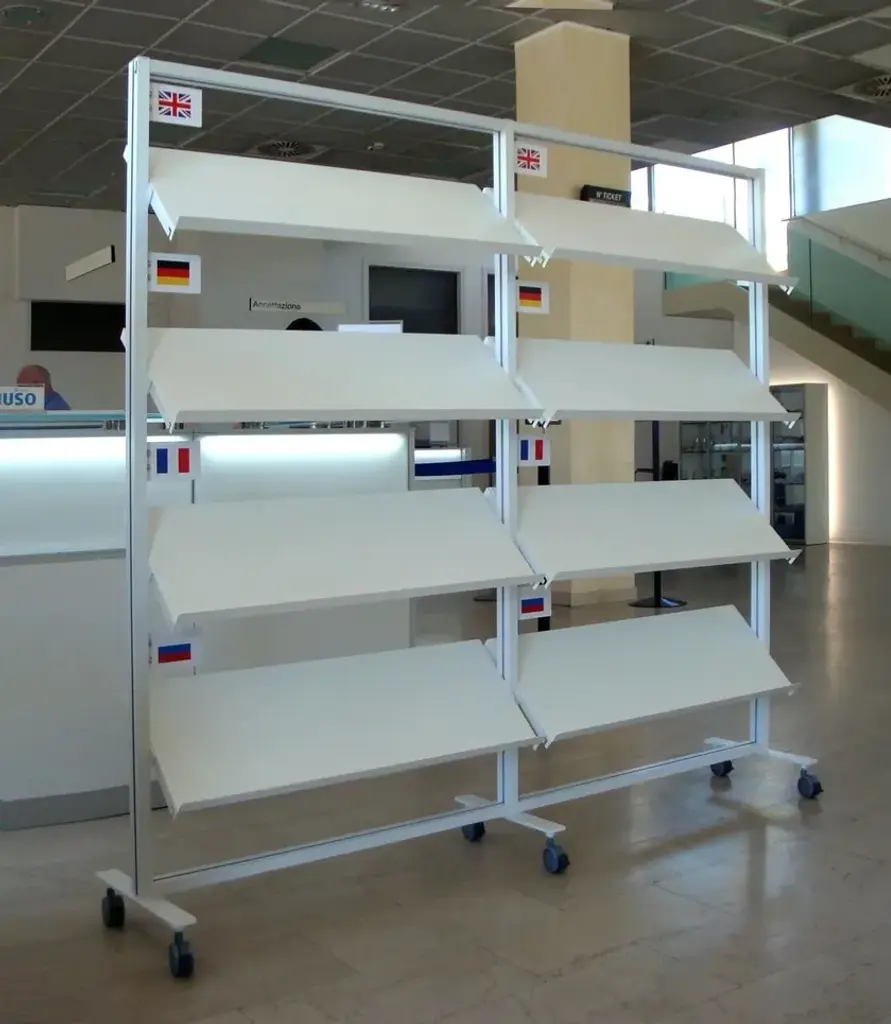 InUno floor-standing gondola display with inclined shelves designed to hold brochures, leaflets, catalogs, and other informational materials. This display comes with wheels for easy movement and can be composed of multiple modules, allowing for an extended display. The shelves, measuring L 120 cm, are inclined to facilitate easy reading of the materials. It is suitable as a gondola for libraries or a display stand for hotels, information points, offices, and schools. Elegant, with a minimalist design, it fits perfectly in any space.InUno is a collection of divider panels, exhibition display panels, notice racks, posters, brochure racks, totems and signage, and lots of solutions. It is a line that is fully configurable in structure, size, colors, and prints to meet different style, space, and brand requirements.
