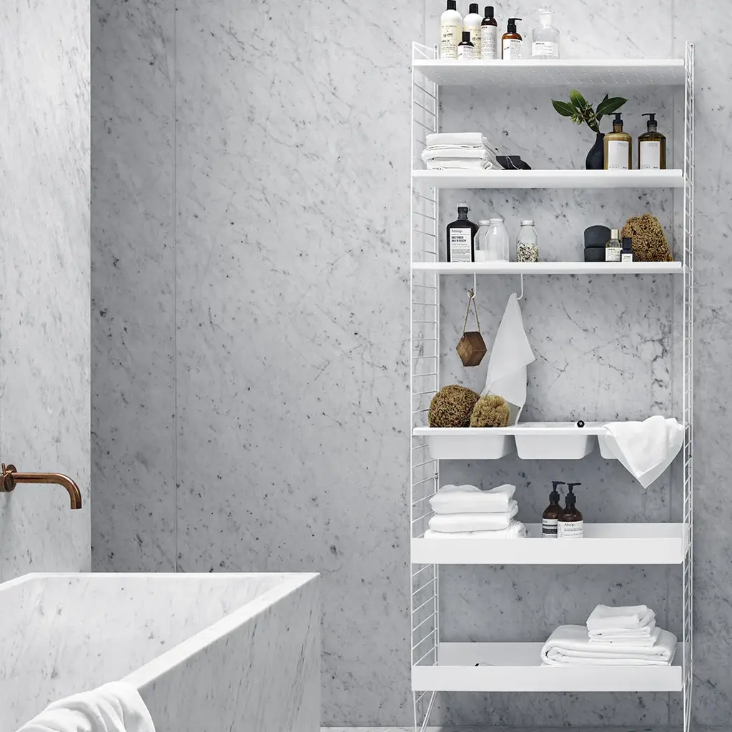 The floor panels are available in three heights, 85 cm, 115 cm, 200 cm along with one depth, 30 cm. The panels are the base when building your string shelf. When the panels are decided you can start adding products with 30 cm depth from String® System. Choose among shelves, cabinets, drawers, magazine shelves and more. The foot of the floor panel rests against the floor which makes the shelf stable while appearing light and airy. Make your shelf even more functional and unique by adding organizers, knife holder or a magazine holder, which all are placed on the panel's threads. The panels come in two different packaging's, either with one floor panel or two floor panels.