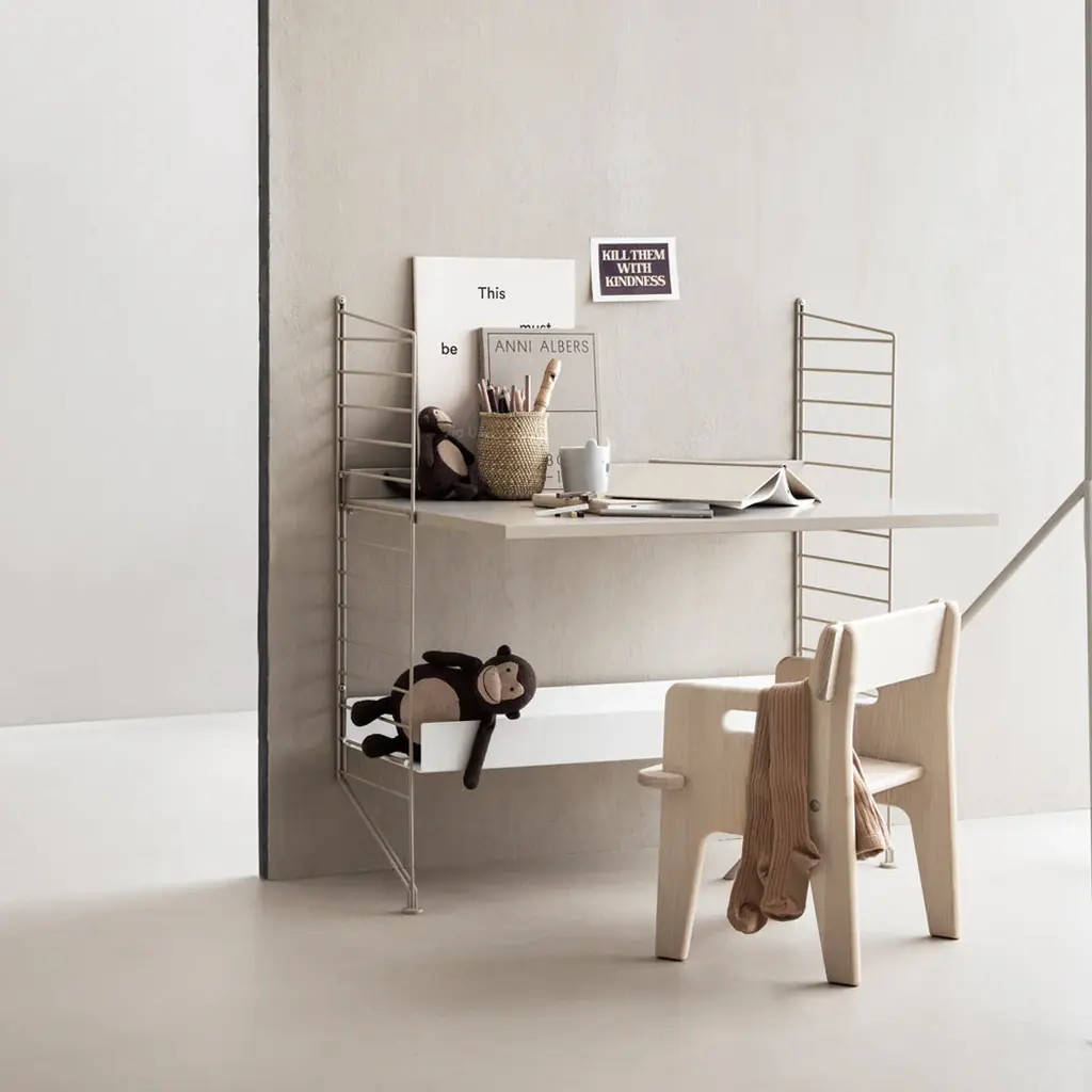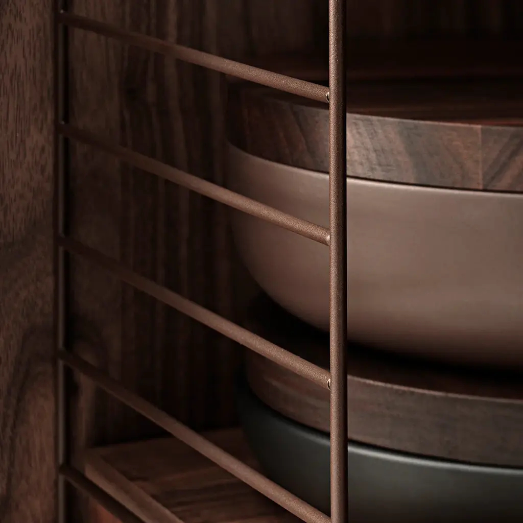 The floor panels are available in three heights, 85 cm, 115 cm, 200 cm along with one depth, 30 cm. The panels are the base when building your string shelf. When the panels are decided you can start adding products with 30 cm depth from String® System. Choose among shelves, cabinets, drawers, magazine shelves and more. The foot of the floor panel rests against the floor which makes the shelf stable while appearing light and airy. Make your shelf even more functional and unique by adding organizers, knife holder or a magazine holder, which all are placed on the panel's threads. The panels come in two different packaging's, either with one floor panel or two floor panels.