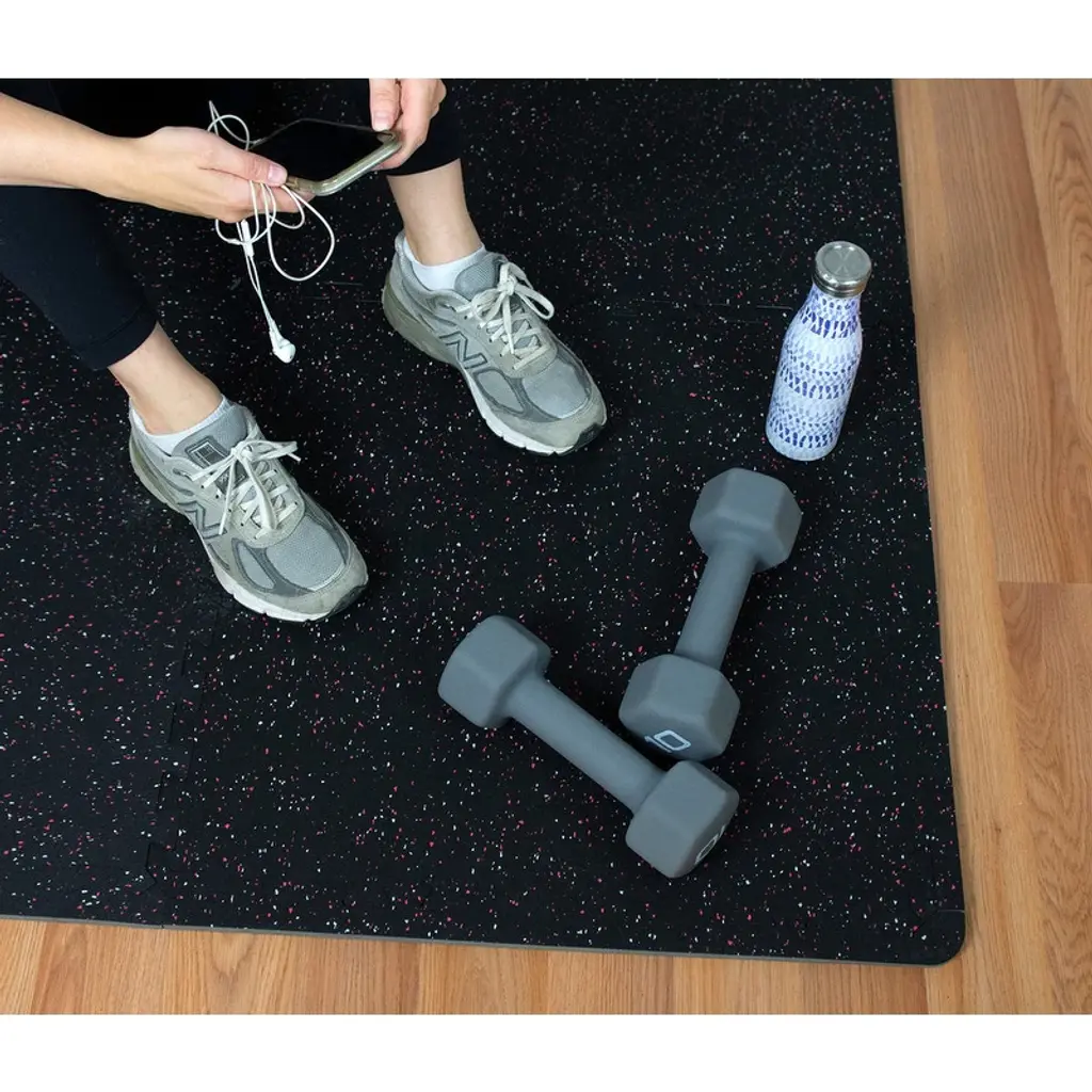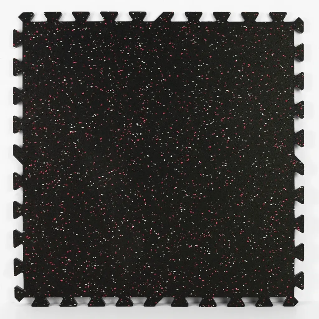 Sweat your heart out without worrying about ruining your floors with our new rubber floor tiles! Designed to withstand your workout, weights, equipment and more, these floor tiles feature a black backdrop with flecks of red and white. Rhyolite Rubber Interlocking Floor Tiles contains 12 pieces including 4 tiles that measure 24-in x 24-in and 8 edges. This product measures 49-in x 49-in x .47-in when assembled. Black and red speckled interlocking rubber floor tiles; Adds cushion to hard surfaces; Perfect for home gyms, work out areas, or play rooms; Includes edge caps for a finished look; Comes with 4 interlocking tiles that measure 24-in x 24-in; Measures 49-in x 49-in when assembled;Water resistant.