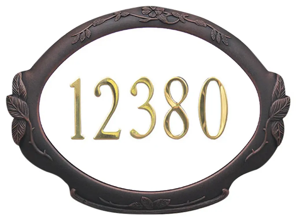 • Please see additional images for color swatch Our floral address plaque marks your home with a unique style. Solid cast aluminum and powder coated to withstand the elements, this beautiful plaque coordinates with our Floral Light Fixtures and Mailboxes.