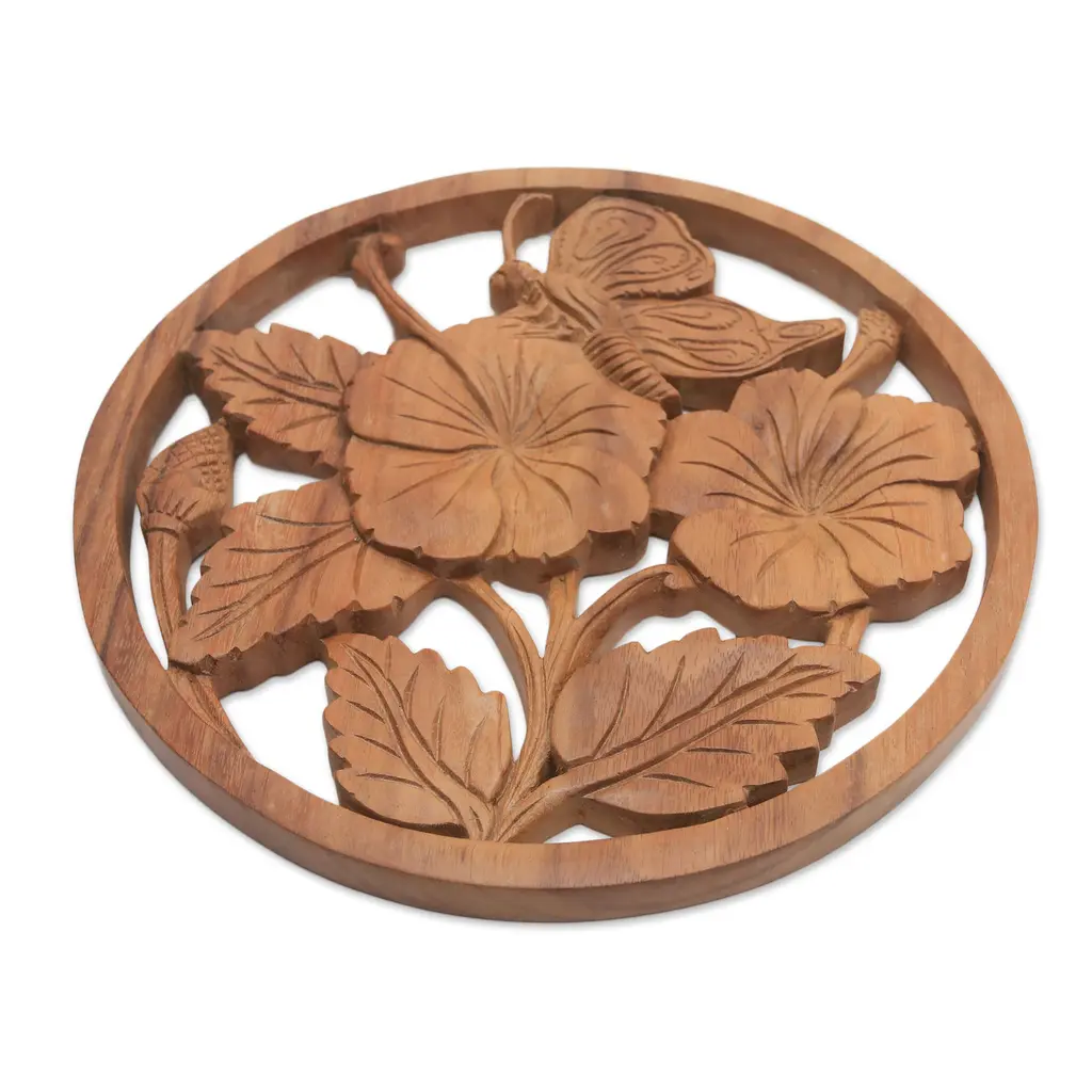 Within a circular frame, a lovely butterfly explores a garden of hibiscus flowers in this relief panel from Bali. Local artisans hand-carve the relief from suar wood with a rich natural grain. Eka presents this majestic addition to your home decor.