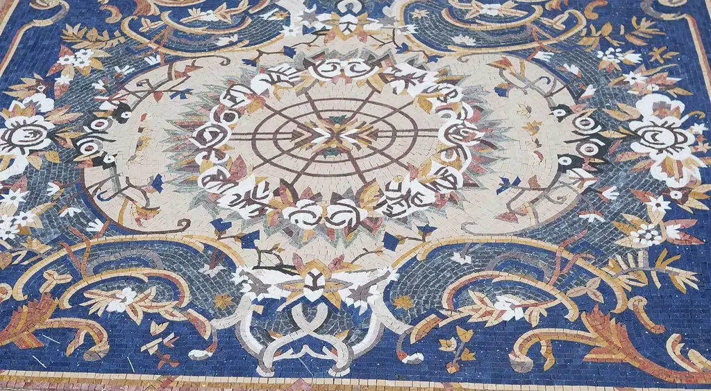 Introducing our stunning "Floral Geometric Floor Mosaic III," a breathtaking piece of art that effortlessly elevates any space in your home. Handcrafted with meticulous care, this exquisite mosaic is composed entirely of natural stones, showcasing the beauty and uniqueness of each individual piece. The intricate floral design is beautifully intertwined with geometric patterns, creating a harmonious blend that adds a touch of elegance to your interior decor.What sets our Floral Geometric Floor Mosaic III apart is its versatility. With the option to customize both size and colors, you can tailor this masterpiece to perfectly complement the theme and atmosphere of any room. Whether you are looking to enhance your living room, hallway, or even a cozy nook, this mosaic can be designed to meet your specifications, ensuring it becomes a unique focal point that reflects your personal style.Each mosaic is not only a decorative element, but also a testament to the artistry of skilled craftsmen who pour their passion into every detail. The natural stones used in the creation of this piece are selected for their durability and aesthetic appeal, ensuring that your mosaic will withstand the test of time while maintaining its beauty.Imagine the warmth and sophistication that the Floral Geometric Floor Mosaic III will bring to your home. It invites admiration and sparks conversation, making it an ideal choice for both homeowners and interior designers seeking to make a statement.Transform your space with this unparalleled work of art, and indulge in the beauty of nature captured in a stunning floor mosaic. Order your customized Floral Geometric Floor Mosaic III today and experience the perfect blend of art, nature, and design in your home.