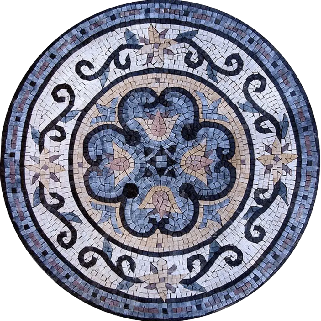 Our stunning Fai floral mosaic rondure showcases a blue design on a rose and ivory background. Create a lively backsplash medallion or decorate a round table for your garden or sun room. Youll find many creative uses for this striking handset stone mosaic medallion.