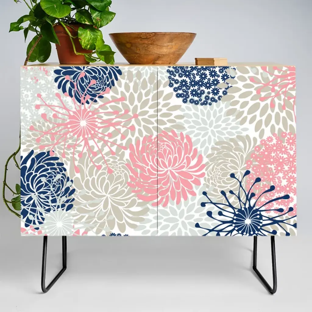 Floral Pattern, Abstract, Orange, Teal And Gray Credenza