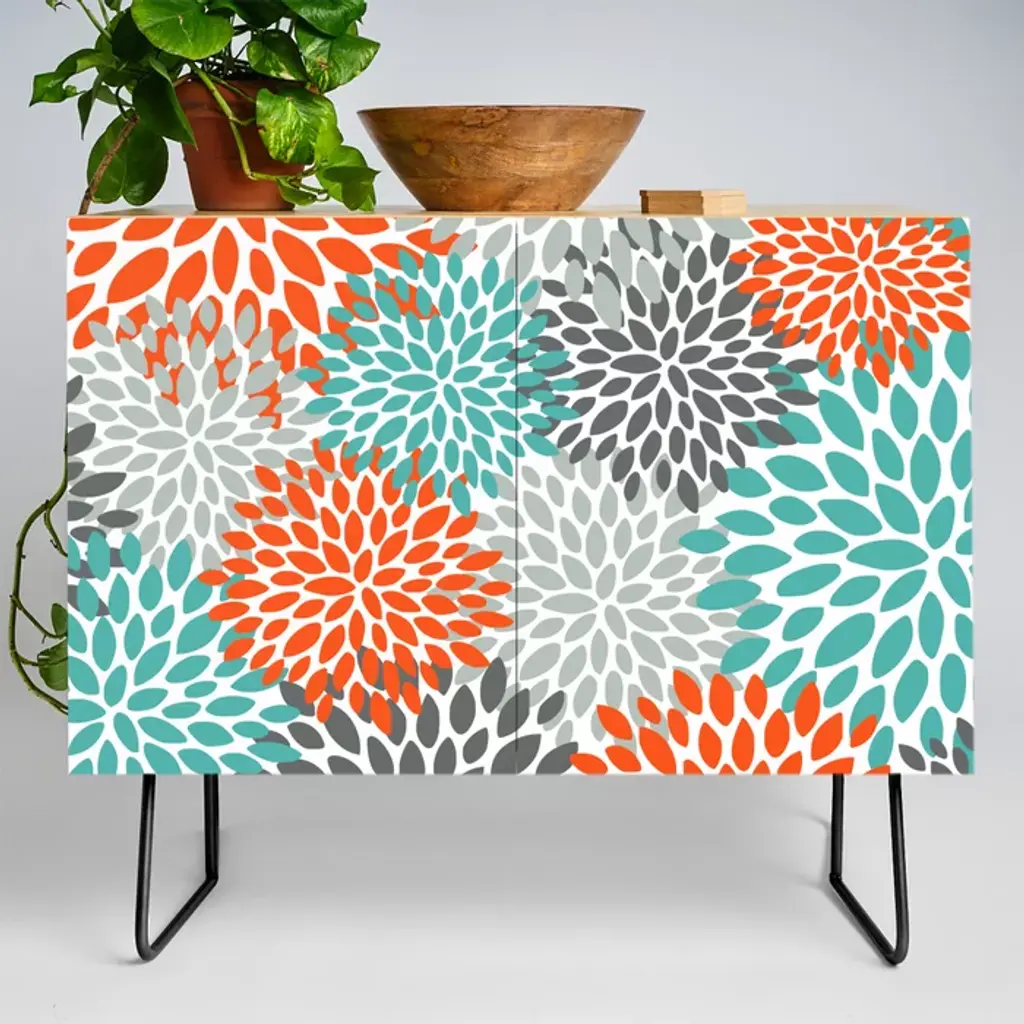 Floral Pattern, Yellow, Pale, Aqua And Gray Credenza