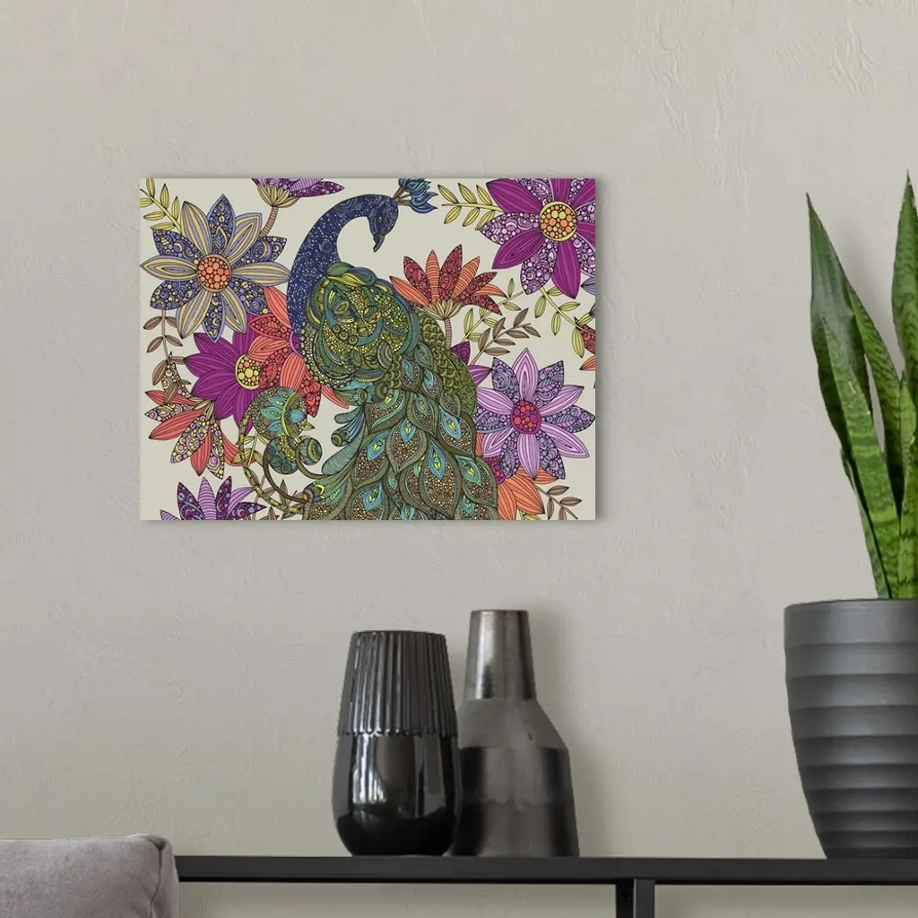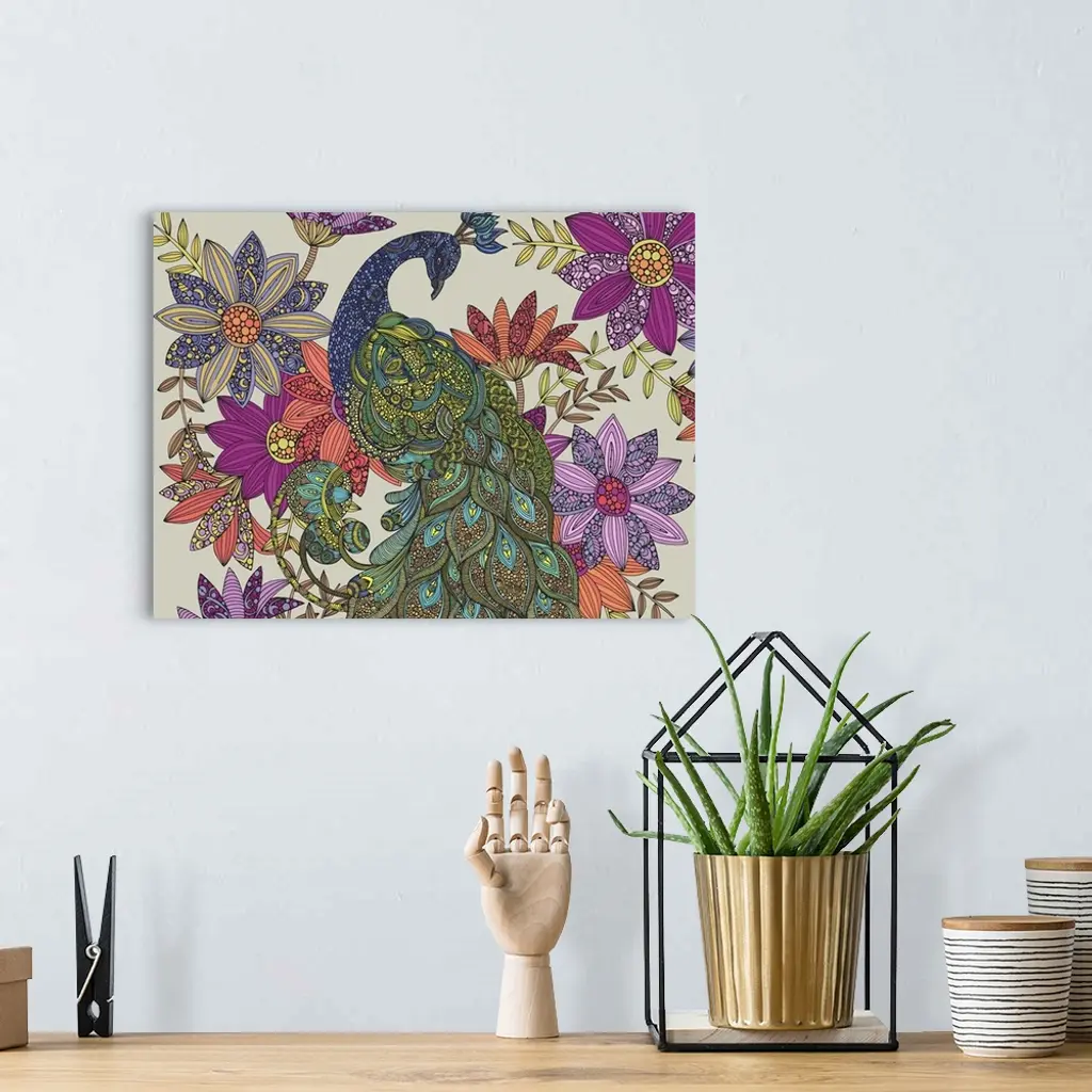 Intricate illustration of a peacock surrounded by flowers on a gray background.