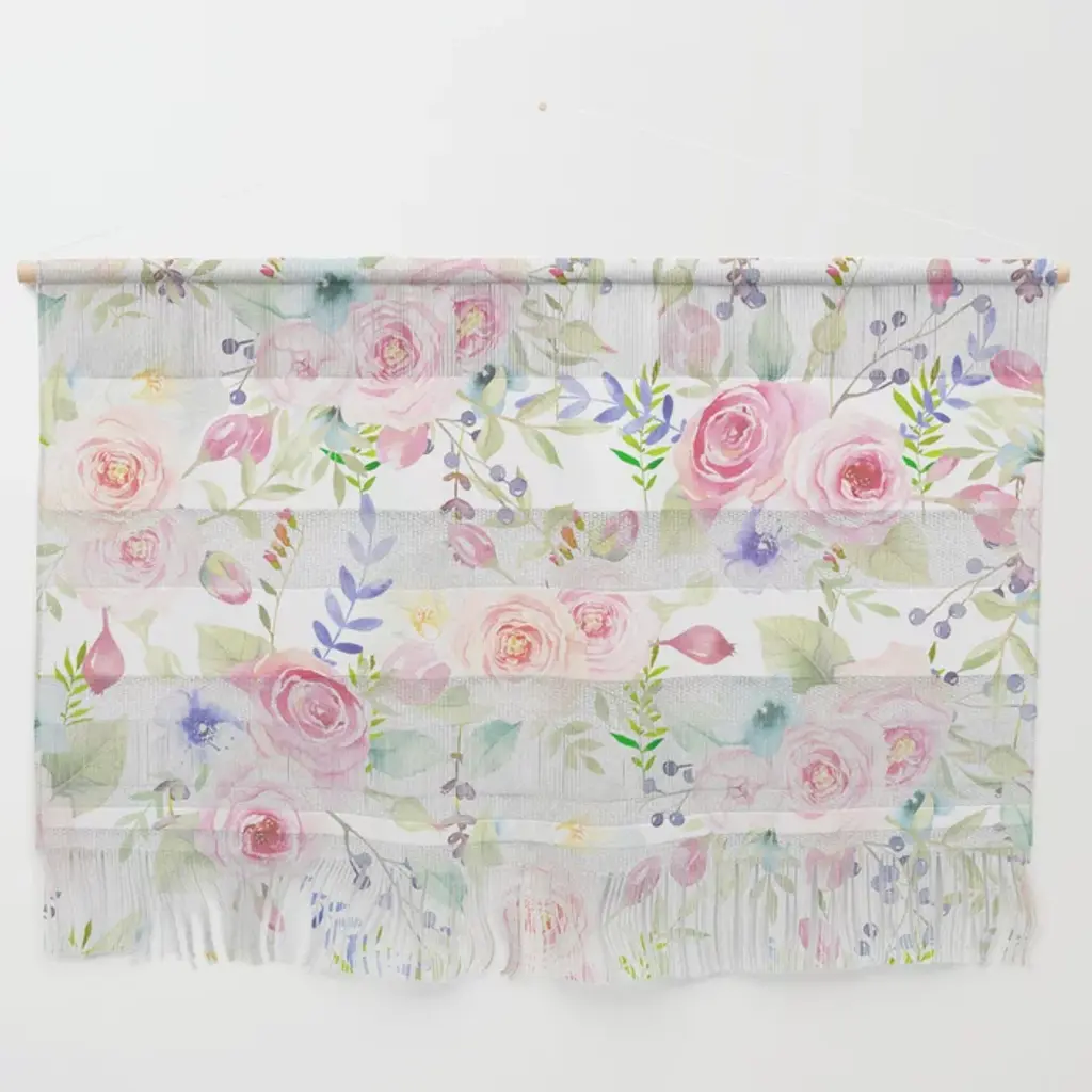 Floral Watercolor Rose Garden, Pink And White Wall Hanging