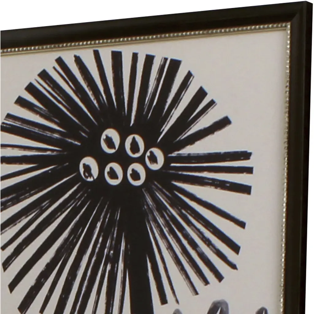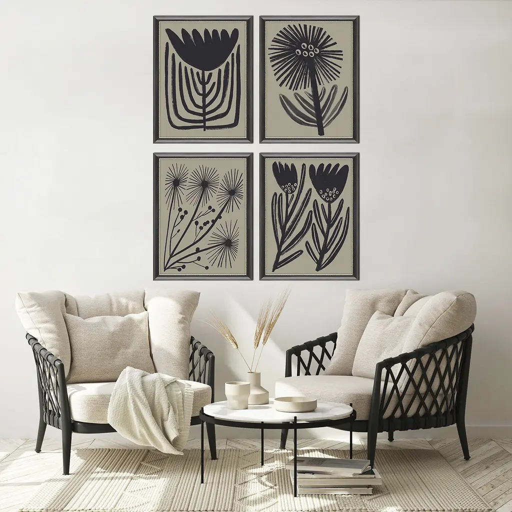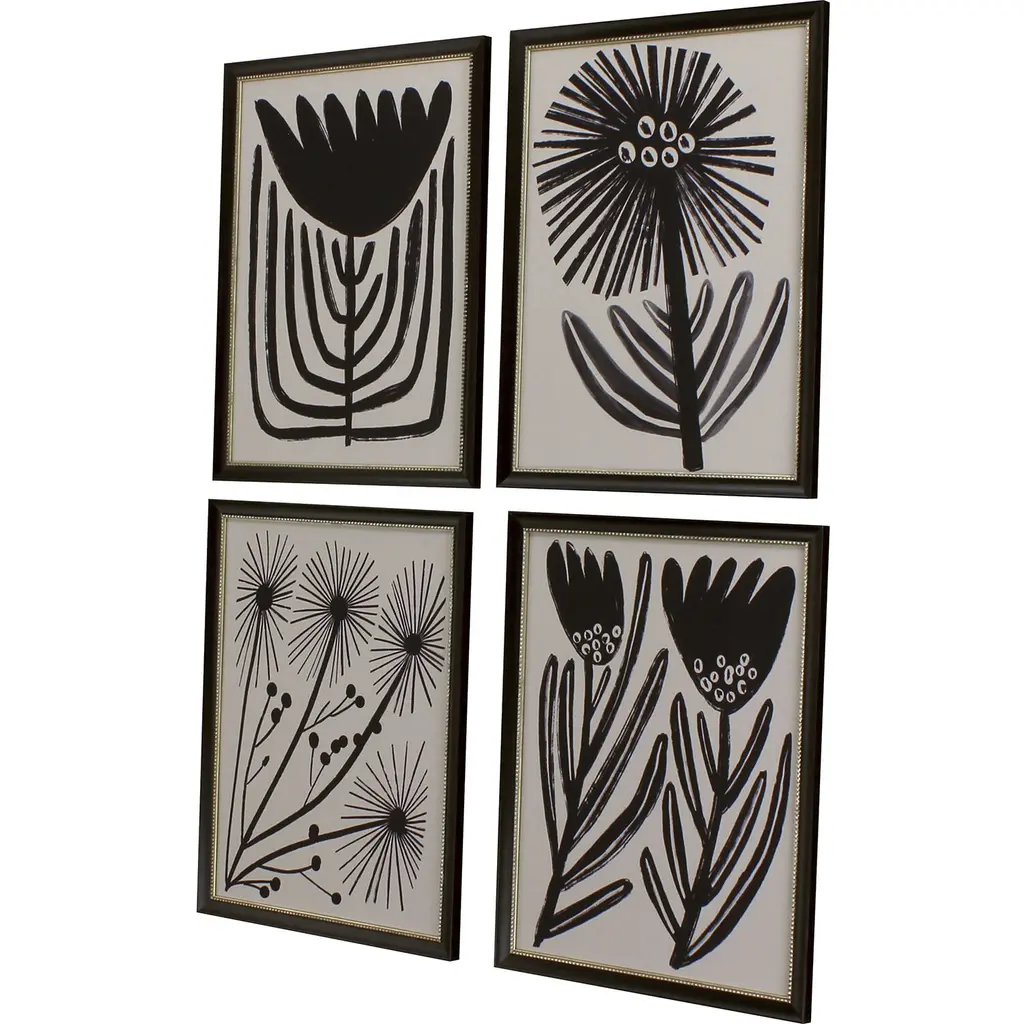 Simple block floral designs have a whimsical folk art feel. Framed in an aged black painted wood with washed antique gold beaded lip.
