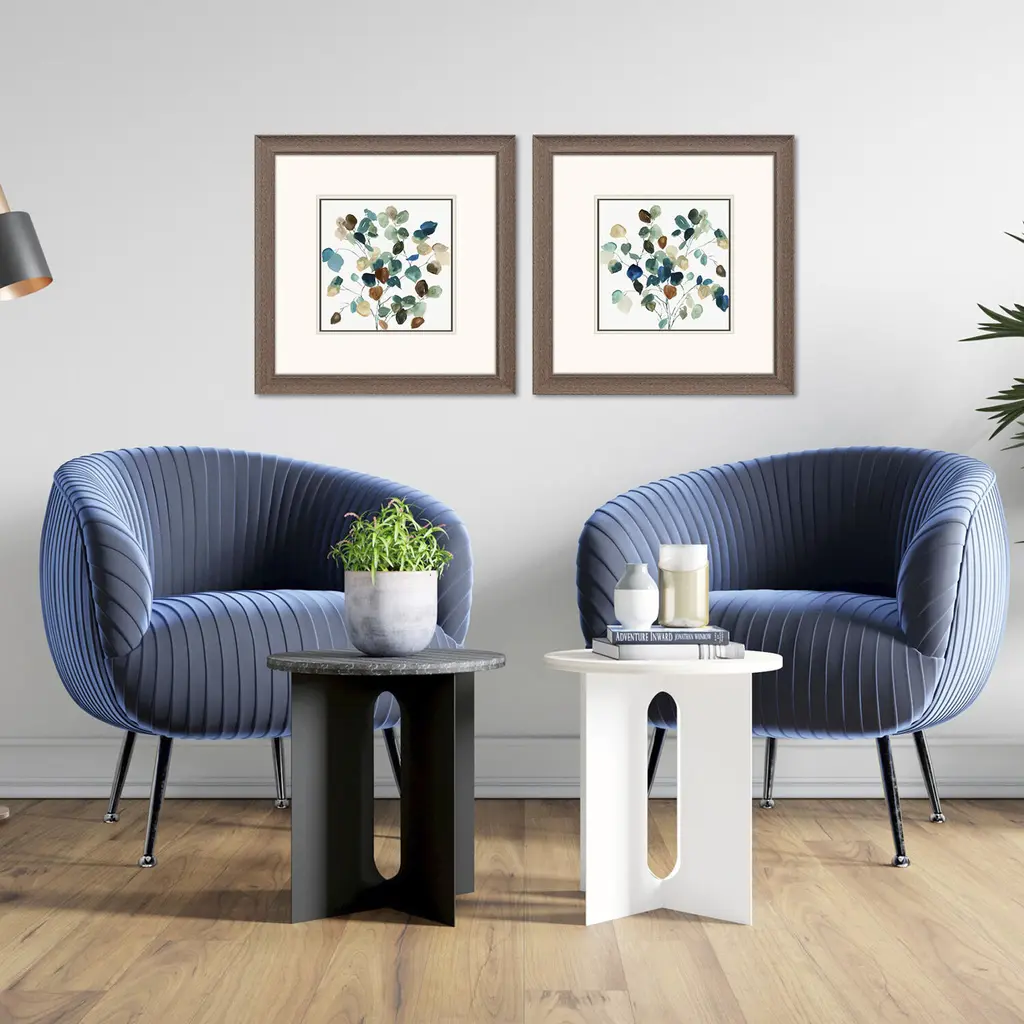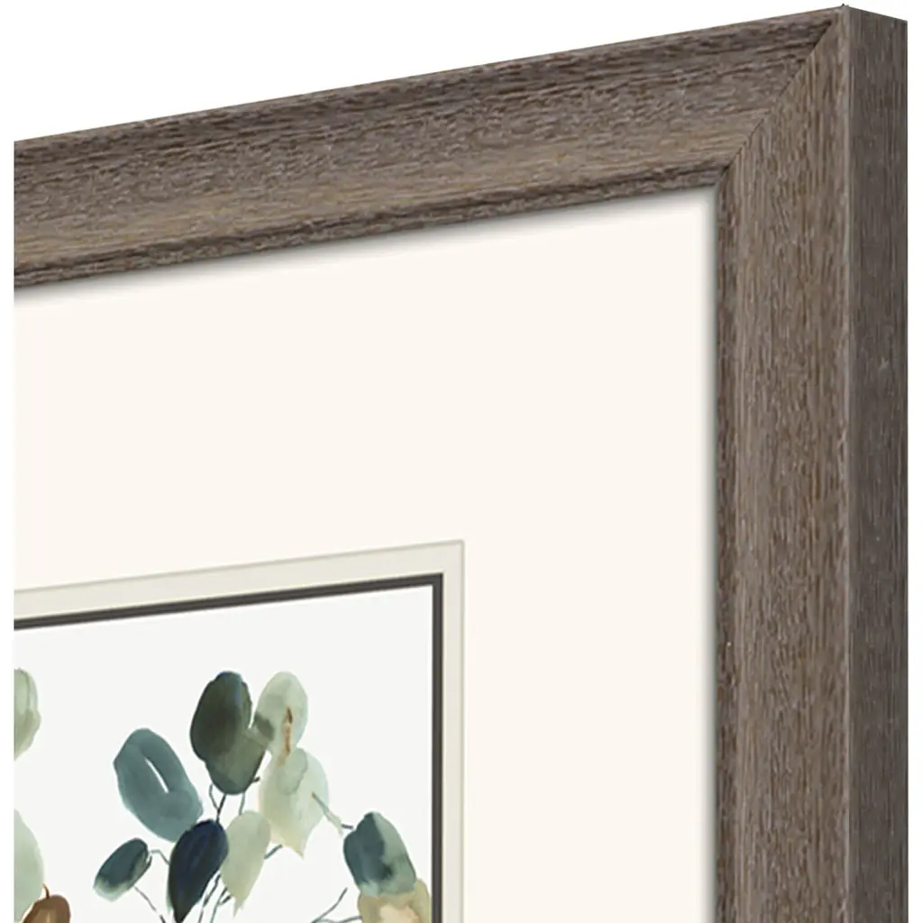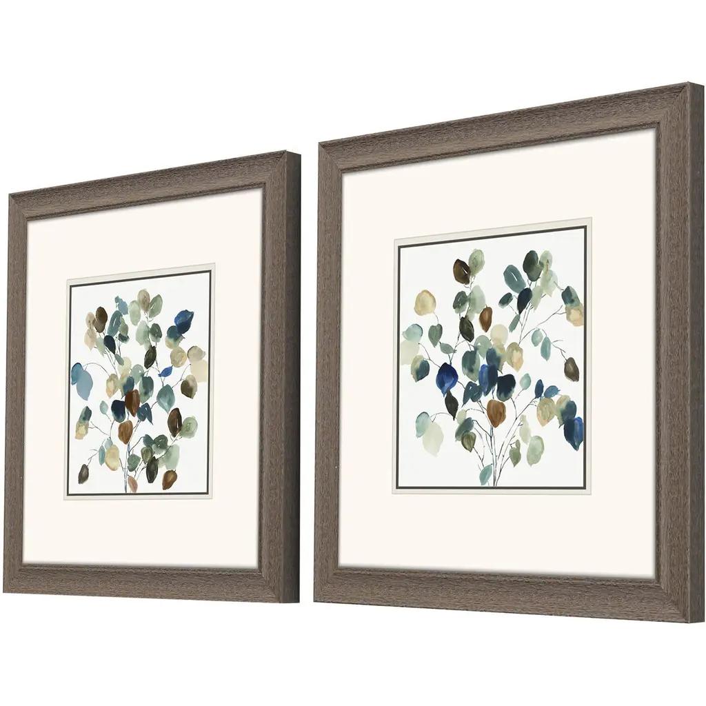A set of two leaf branch images that are accentuated with heavy matting. These pieces are framed under glass and paired with a wood tone frame.