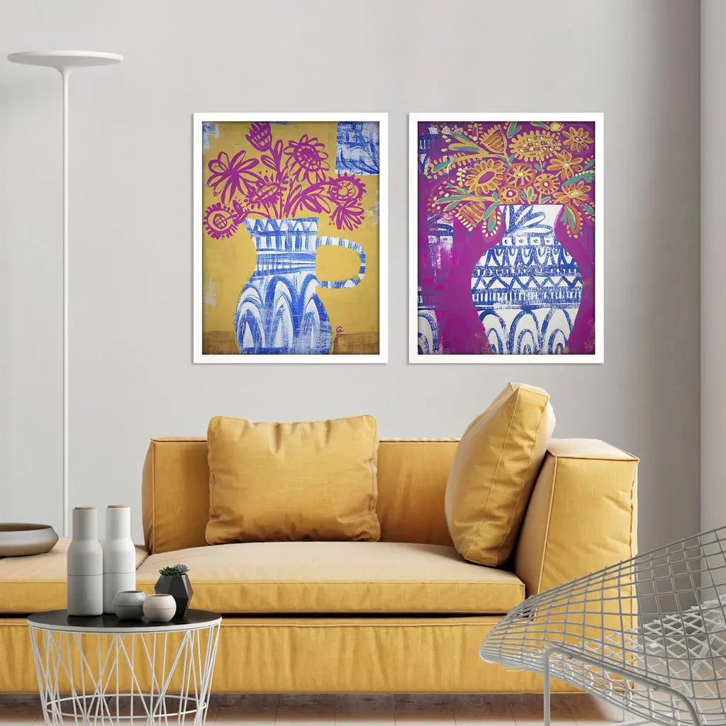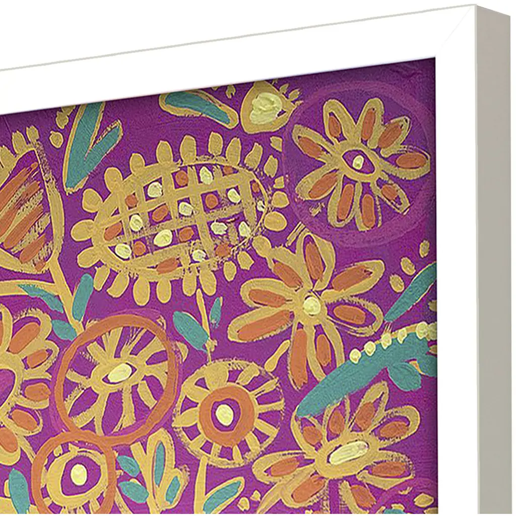 Whimsical florals pop with color and pattern to make you smile. Shadow boxed and framed in a lacquered white wood shadow box style moulding.