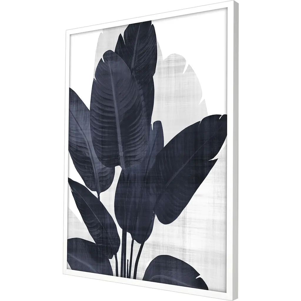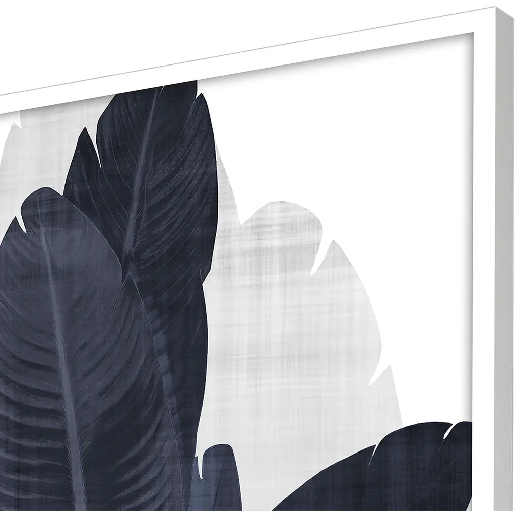 A modern take on the botanical, a dynamic palm was inspired by the tropical flora on Harbour Island. Framed in a lacquered white wood moulding.