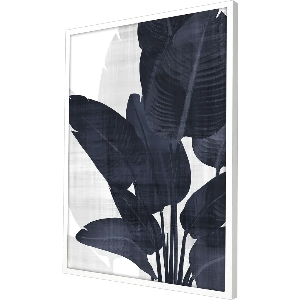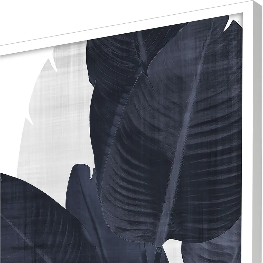 A modern take on the botanical, a dynamic palm was inspired by the tropical flora on Harbour Island. Framed in a lacquered white wood moulding.